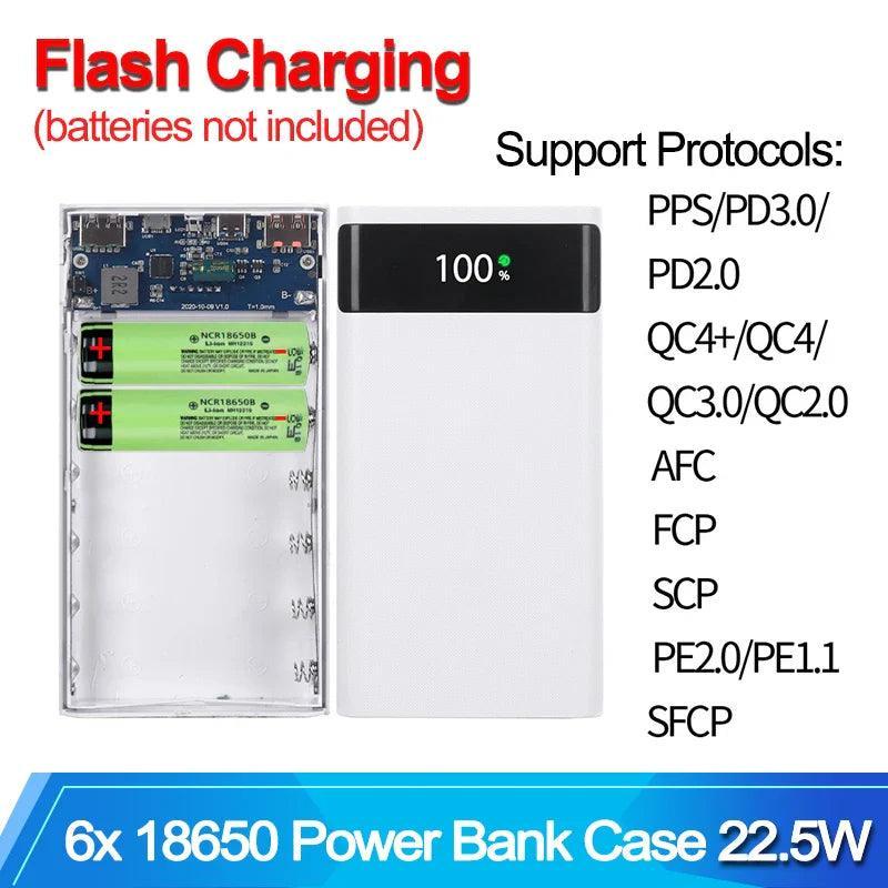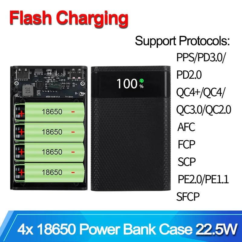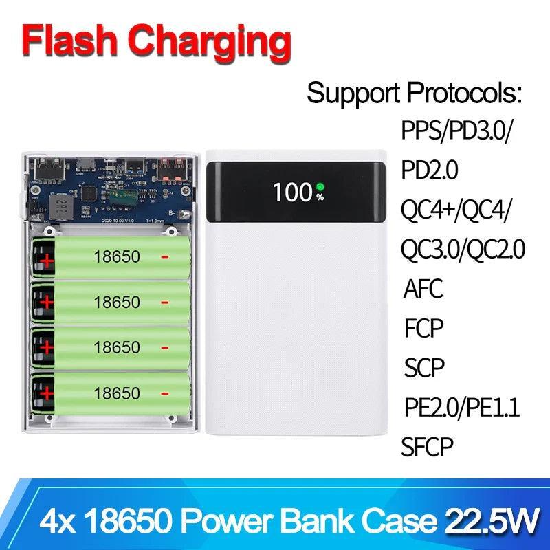DIY 18650 Power Bank Case Dual USB C Fast Charging 22.5W lets you convert 18650 cells into a portable charger with up to 22.5W output. Supports 4, 6, or 8 cells, PPS/PD3.0/PD2.0, QC4+ compatibility, LED power display, smart load detection, and built-in safety features for reliable on-the-go charging.