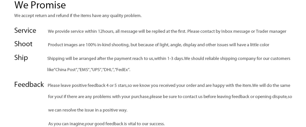 30 days returns. 100% Money back guaranteed no question ask. If the mistake is from Us. See details