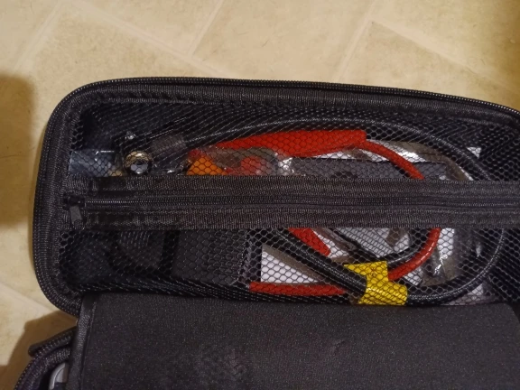 A: The box includes 1 x car jump starter, 1 x protective clamps, 1 x Type-C cable, 1 x inflator hose, 1 x instructions, and 1 x storage box; its compact design makes it easy to store in a trunk or garage for quick access.