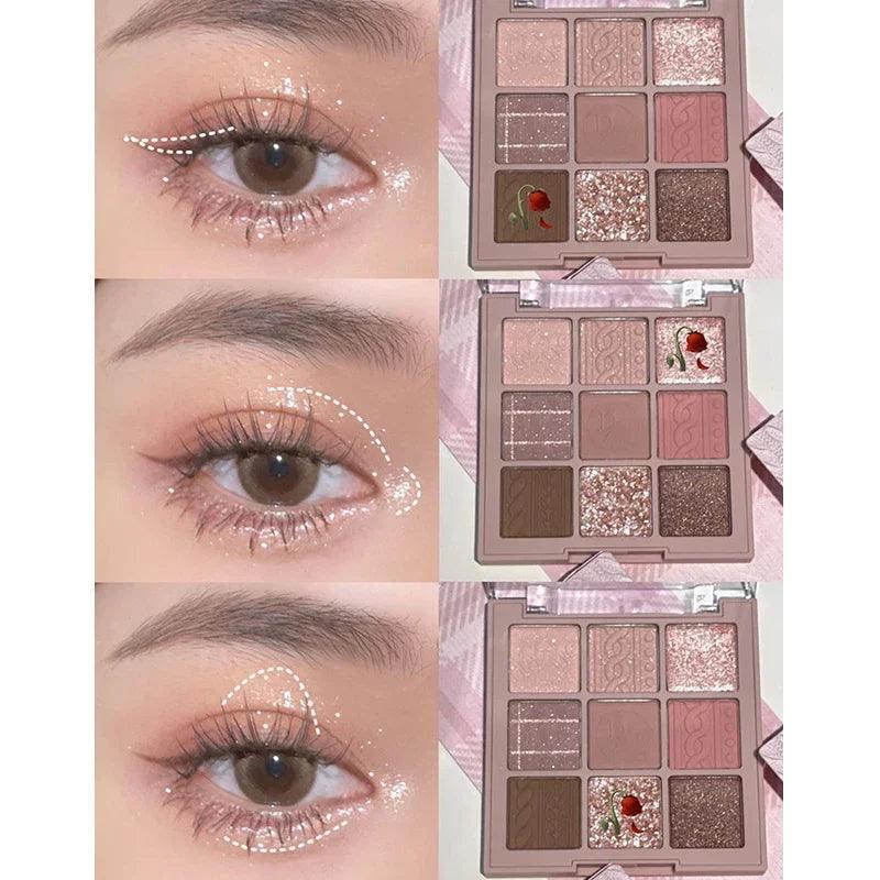 The Korean Charm Eyeshadow Palette Captivating Finishes blends nine shades across Glitter, Pearly, and Matte textures, enabling easy progression from a subtle daytime lid to bold evening drama. Its pigment-rich formula provides smooth blending, strong adhesion, and durable, crease-resistant wear for all-day eye makeup.