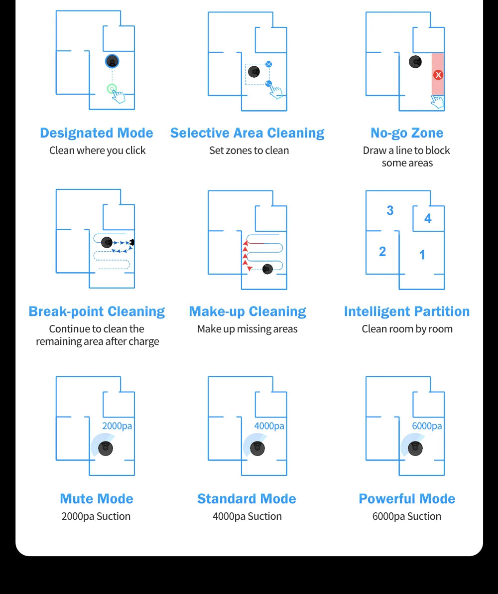 • Customizable Cleaning: The app allows you to set up to four virtual barriers, ensuring your robot cleans only designated areas.