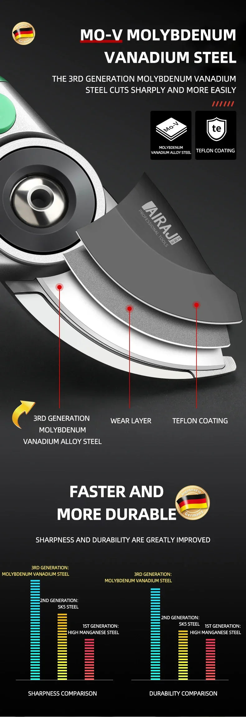 A: AIRAJ stands out with its ultra-fine polished blade, durable bypass mechanism, anti-slip grip, and CE certification. This labor-saving pruning shear delivers cleaner cuts, healthier plants, and longer tool life, making it a preferred choice for serious gardeners who prize precision and comfort in every snip.