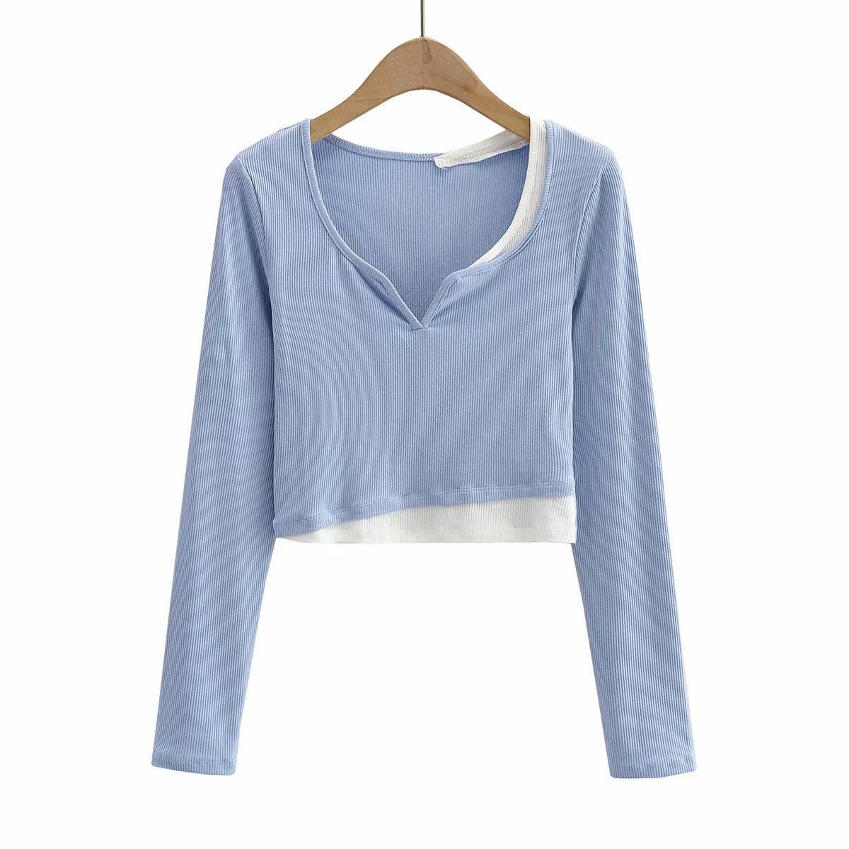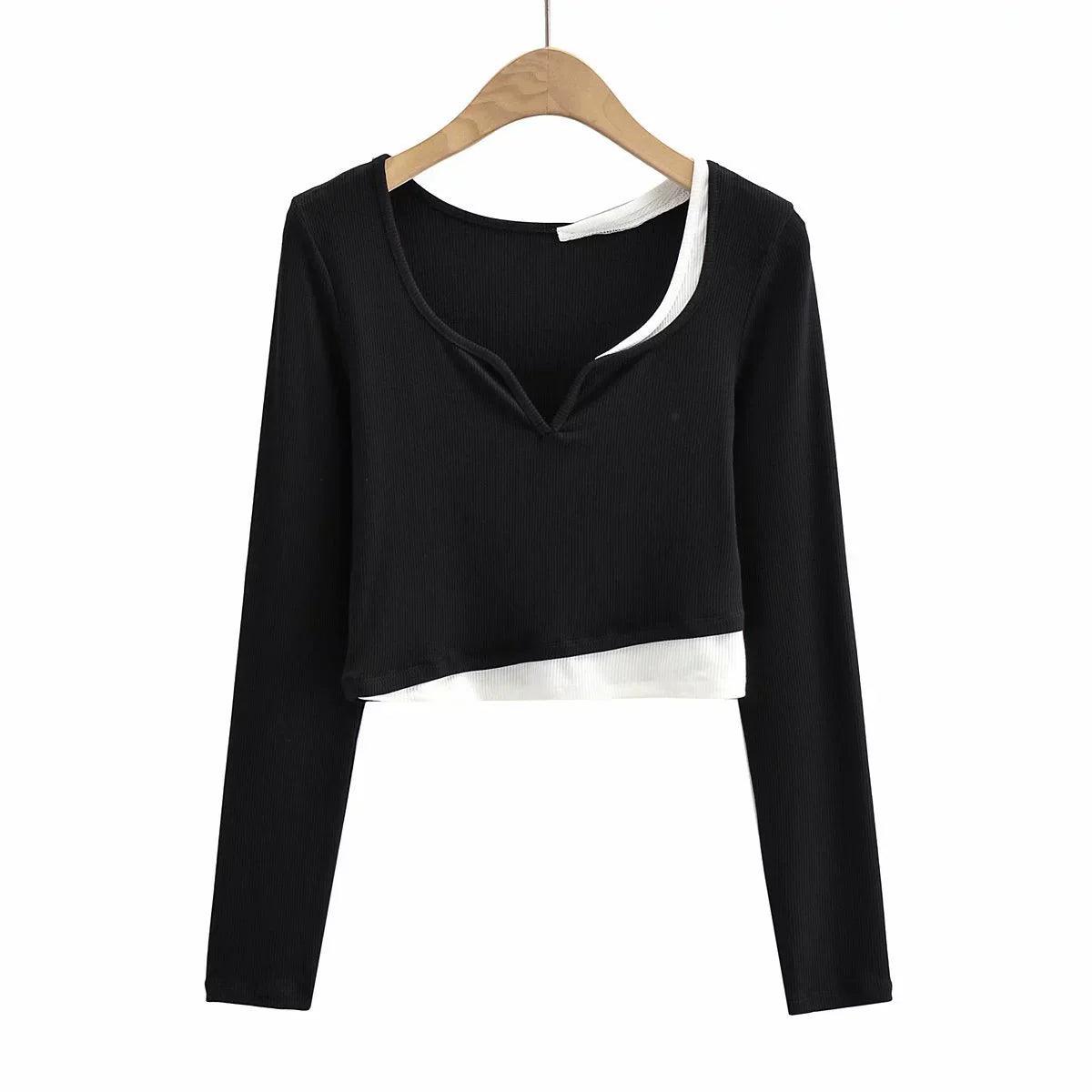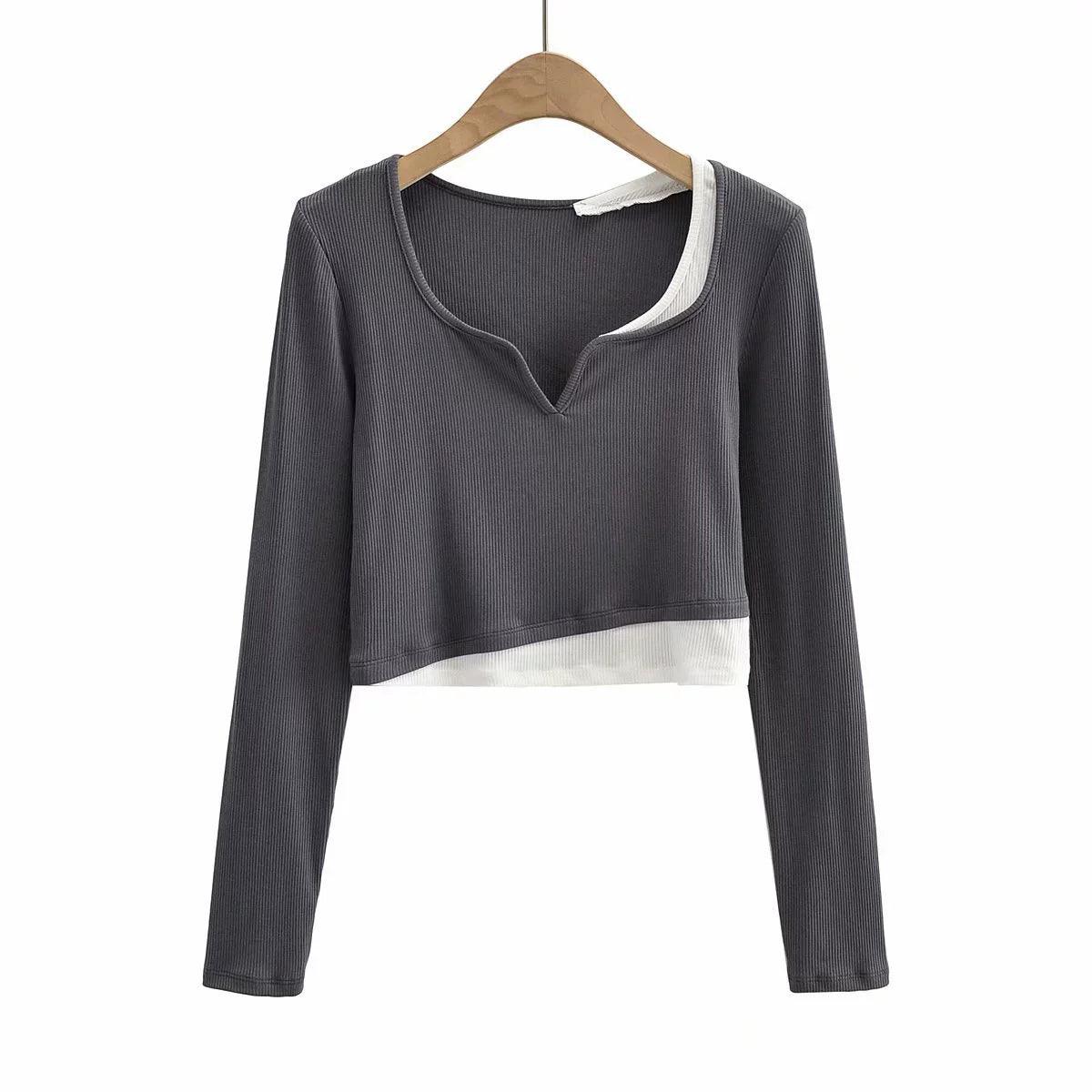 Featuring a captivating fake two-piece look, this top elevates your outfit with its distinctive splicing design. The round collar adds an elegant touch, making it a versatile piece suitable for various occasions, from casual outings to chic gatherings.