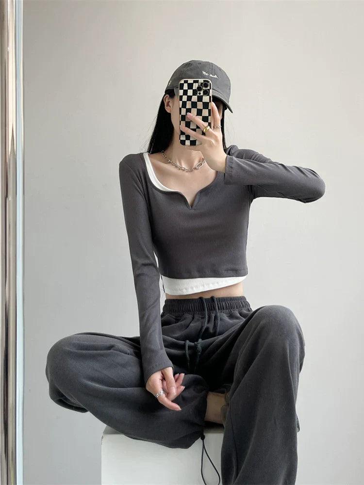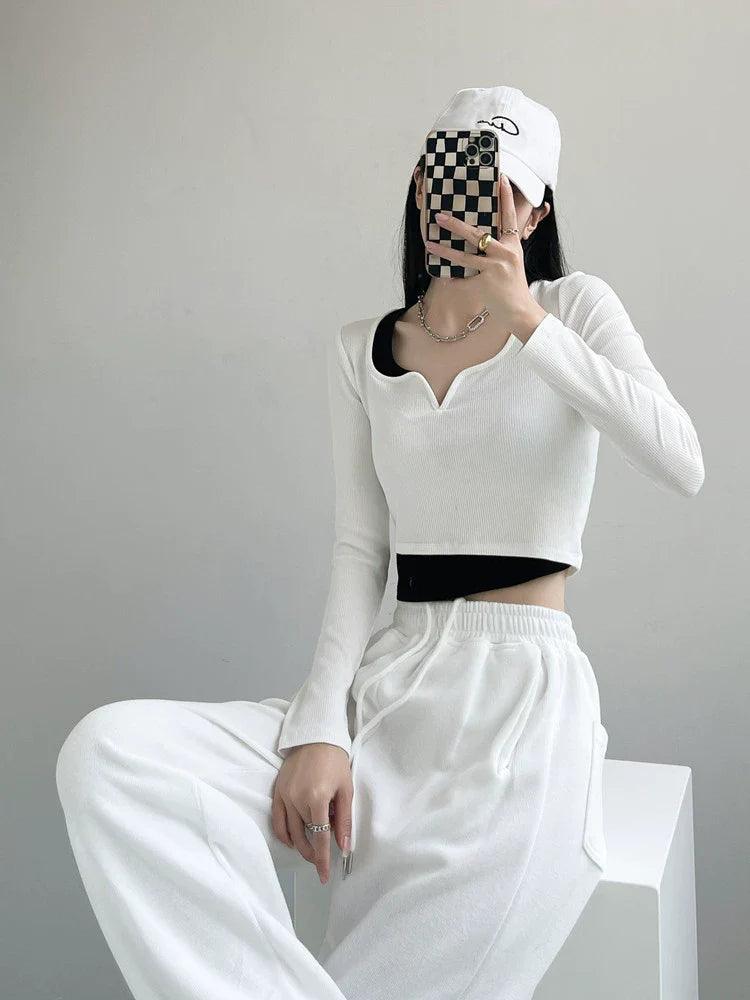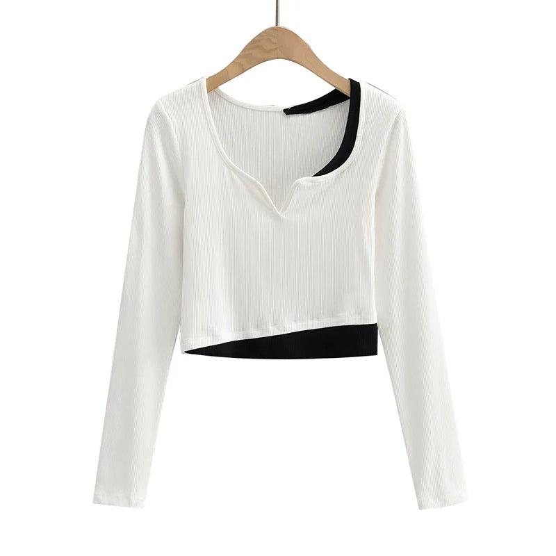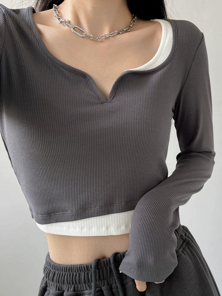 Featuring a captivating fake two-piece look, this top elevates your outfit with its distinctive splicing design. The round collar adds an elegant touch, making it a versatile piece suitable for various occasions, from casual outings to chic gatherings.
