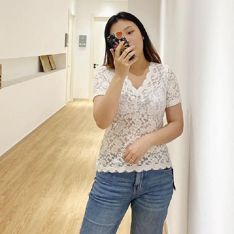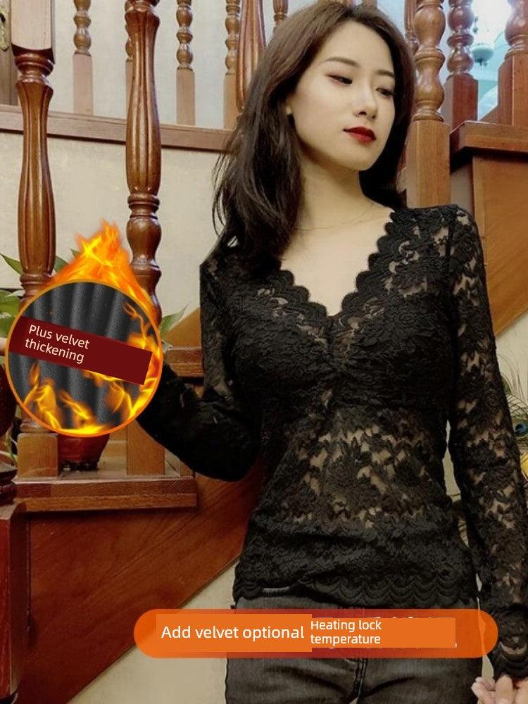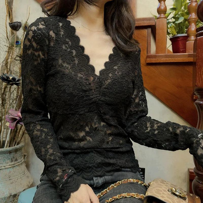Autumn Chic: Elegant Black Lace V-neck Shirt for Women