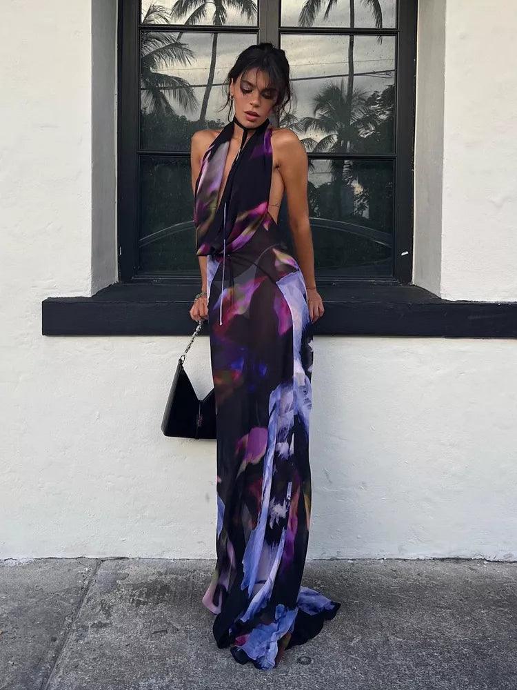 Elevate your summer wardrobe with the Elegant Purple Print Halter Maxi Dress Stylish Beachwear. This stunning dress is crafted from premium polyester and mesh materials, ensuring maximum comfort without compromising on style. Featuring a chic backless design and a flattering halter neckline, it's the ultimate choice for those sun-soaked days.