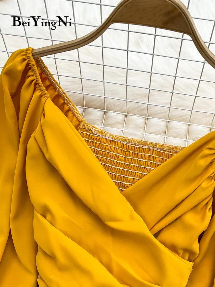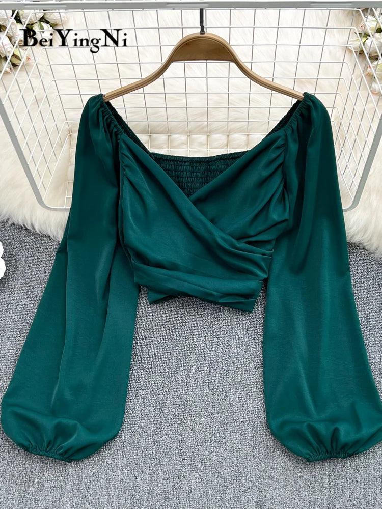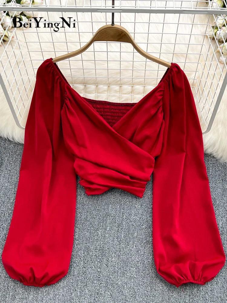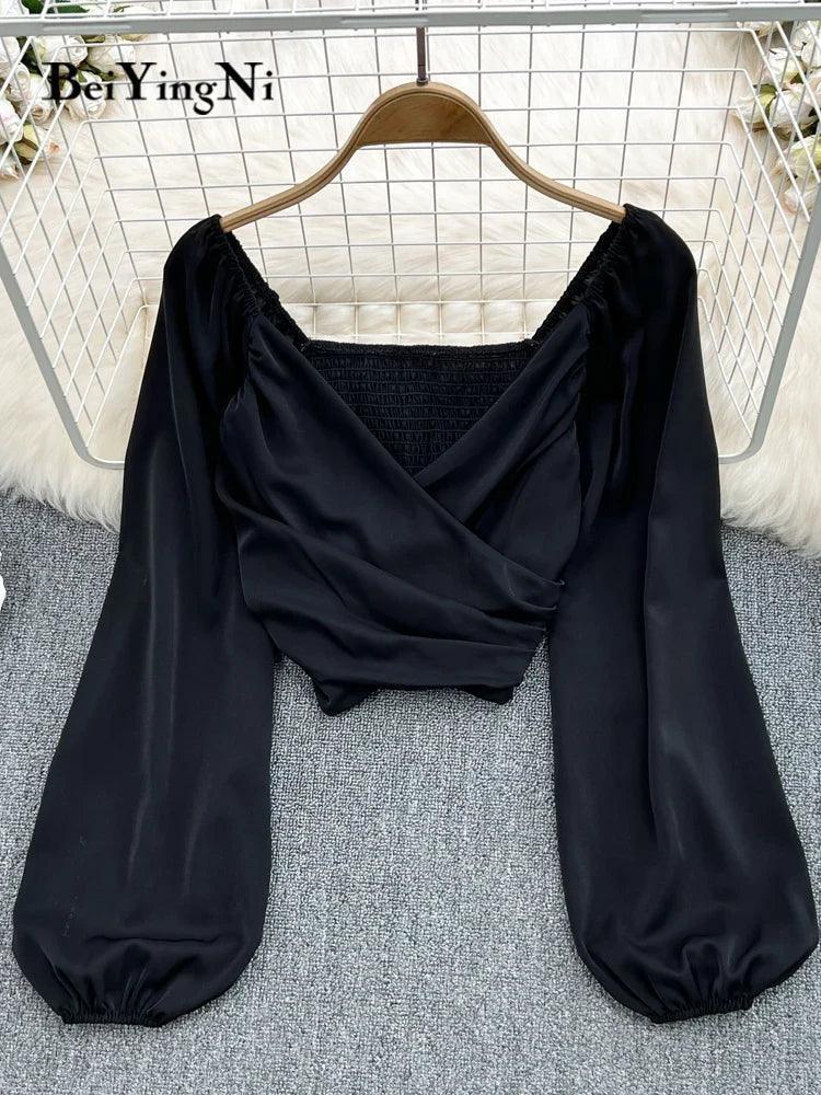 Beiyingni Chic V-neck Puff Sleeve Crop Tops Stylish Blouses