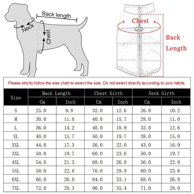 A: This vest is offered in sizes S through 7XL, expressly designed for large breed dogs. The Winter Warm Waterproof Dog Vest Jacket for Large Breeds provides ample chest coverage and adjustable closures, ensuring a secure fit for Bulldogs, Golden Retrievers, Labradors, and other substantial breeds.