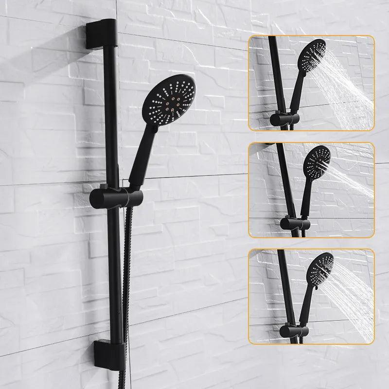 The adjustable wall-mount slide bar lets you set the handheld head height to your preference, making the Black Luxe Rain Shower Head Set High Pressure Wall Mount comfortable for users of all heights and ensuring optimal reach from a standing or seated position.