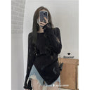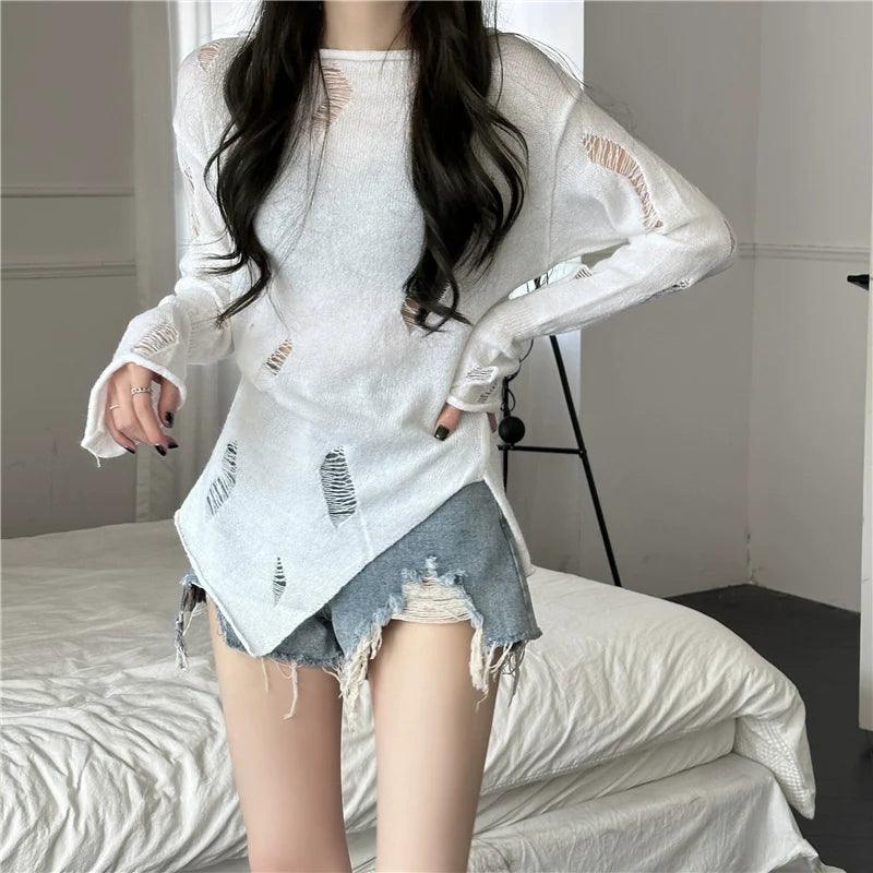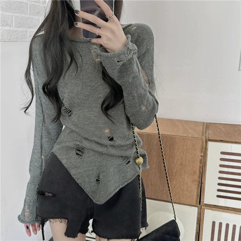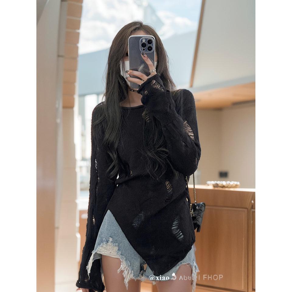Black Ripped Hollow Long Sleeve Knit Women's Pullover Korean Style Fashion Statement