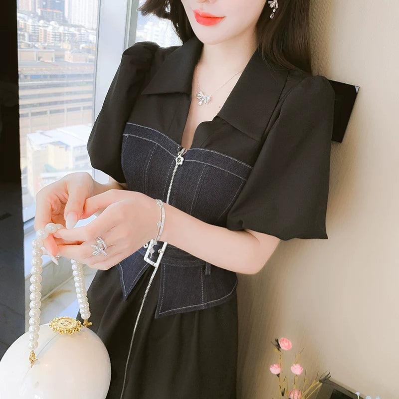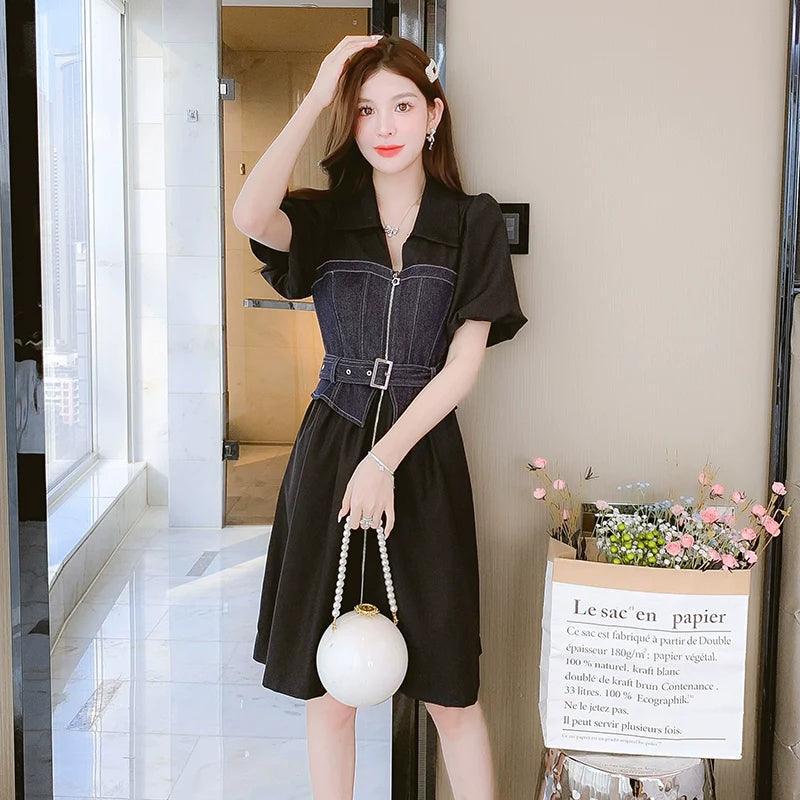 A: The high waist visually elongates the torso while the slim-fitting bodice and gently flared skirt balance proportions. The thin denim keeps the fabric breathable on warm days, and the doll collar adds a touch of whimsy without bulk. This combination creates an effortlessly flattering line for curvier, straighter, or athletic figures alike.