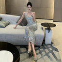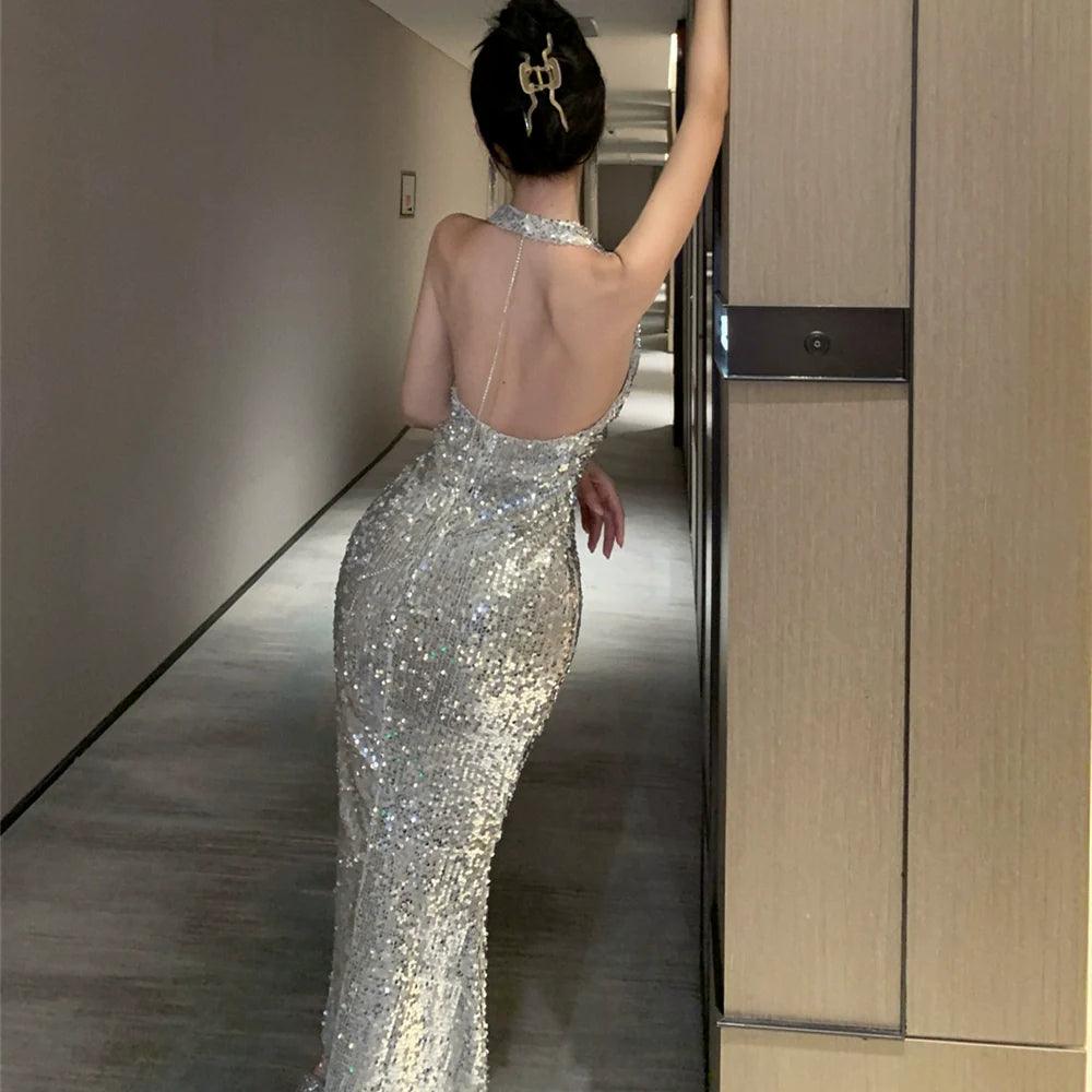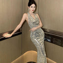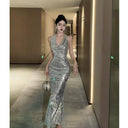 Transform your evening with the Silver Sequin Evening Gown Elegant V-Neck Dress Glam Events and embrace the glamorous side of life! Order now to make a stunning impression!