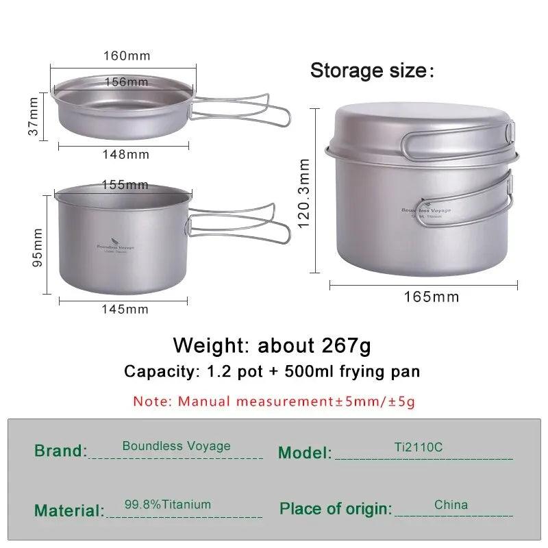 Camping Cookware Set Lightweight Titanium with Folding Handles This premium cookware set is crafted for adventurers who value both functionality and portability. Whether you're hiking through the mountains or camping by the lake, this set will be your reliable cooking companion.