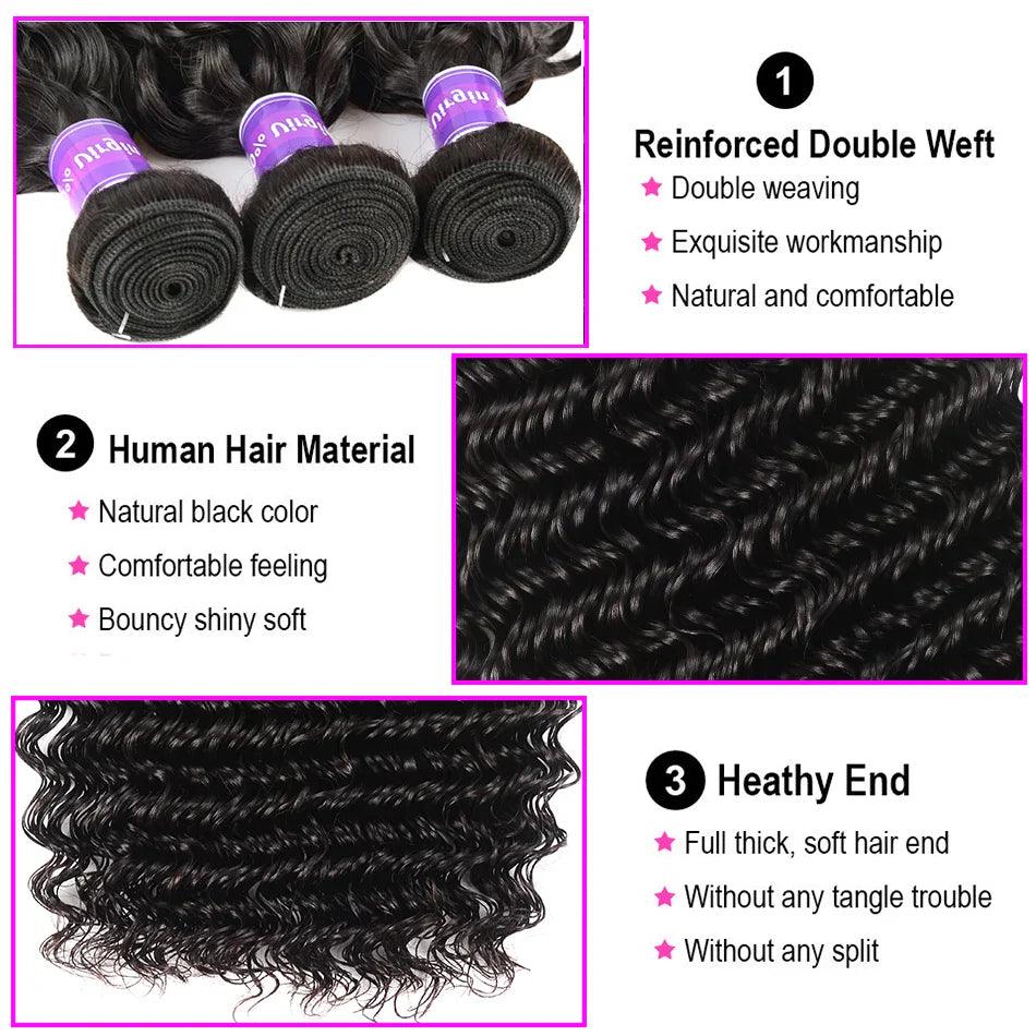 Elevate your hair game with our Luxury Brazilian Deep Wave Remy Hair Bundle Set. Perfect for both everyday wear and special occasions, this premium choice caters to those who seek quality and effortless beauty.