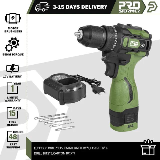 PROSTORMER 17V Cordless Brushless Electric Drill 55NM Torque