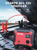 • High-Powered Jump Starter: Revive 12V vehicles with a peak current of 3500A, capable of starting heavy-duty trucks up to 40 times on a single charge, even in extreme temperatures (Jump Starter).