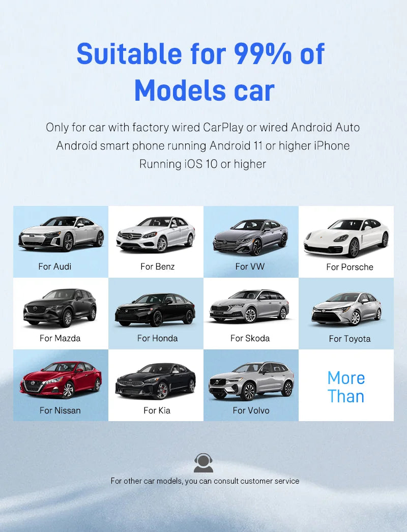 • Wide Compatibility: The adapter works seamlessly with 99% of OEM cars that support wired CarPlay or Android Auto, compatible with iPhones (iPhone 6 and above) and Android devices (Android 11 and above).