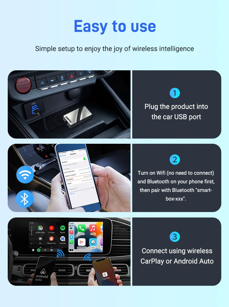 Getting started is simple. Plug the USB adapter into your car’s USB port. Make sure to activate Bluetooth and WiFi on your smartphone, then pair it with the adapter. Once connected, you can enjoy the complete CarPlay or Android Auto interface with all your preferred apps, eliminating clutter and ensuring a stable, reliable connection.