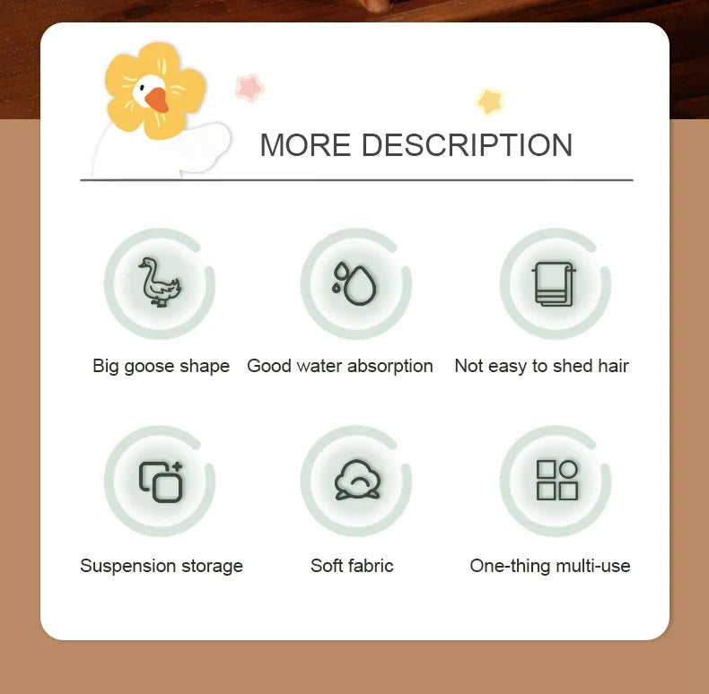 This towel stands out with its unique design and efficient drying properties. The playful cartoon goose is not just a towel; it's a delightful accessory that can serve as a perfect gift for your friends and family.
