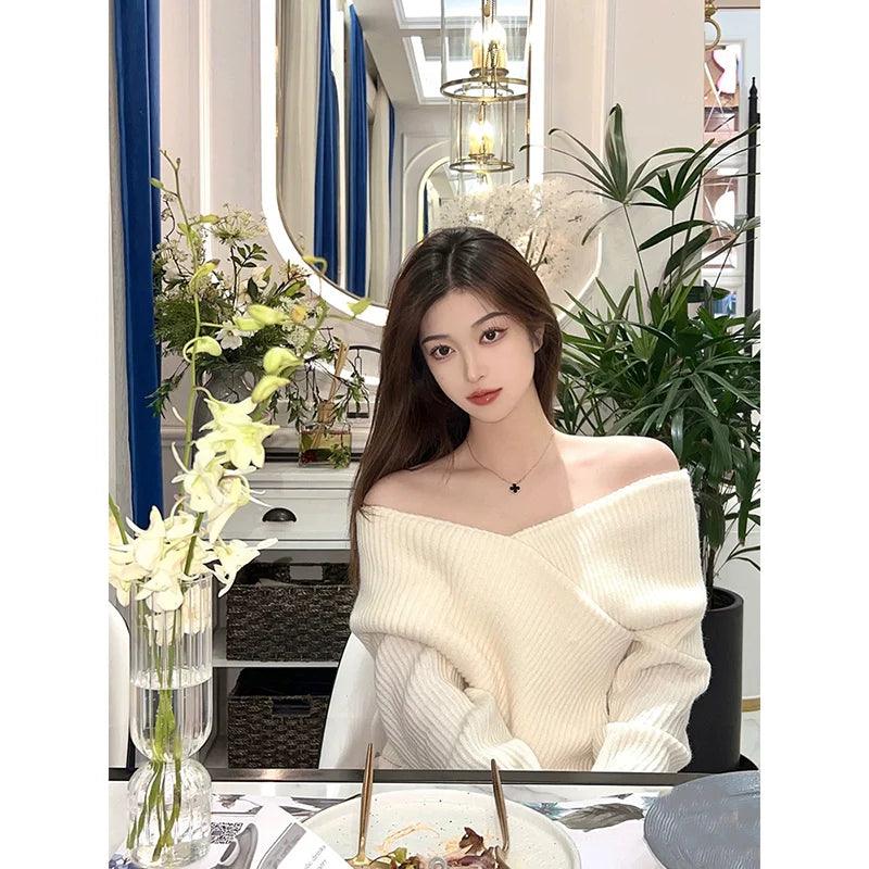 White Knit V-Neck Sweater: Stylish Off-Shoulder Design
