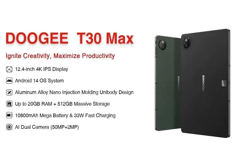 Whether you're a professional, student, or creative, the DOOGEE T30 Max 12.4" 4K Android Tablet 20GB RAM 512GB Storage is your all-in-one solution. Order now and elevate your digital experience!