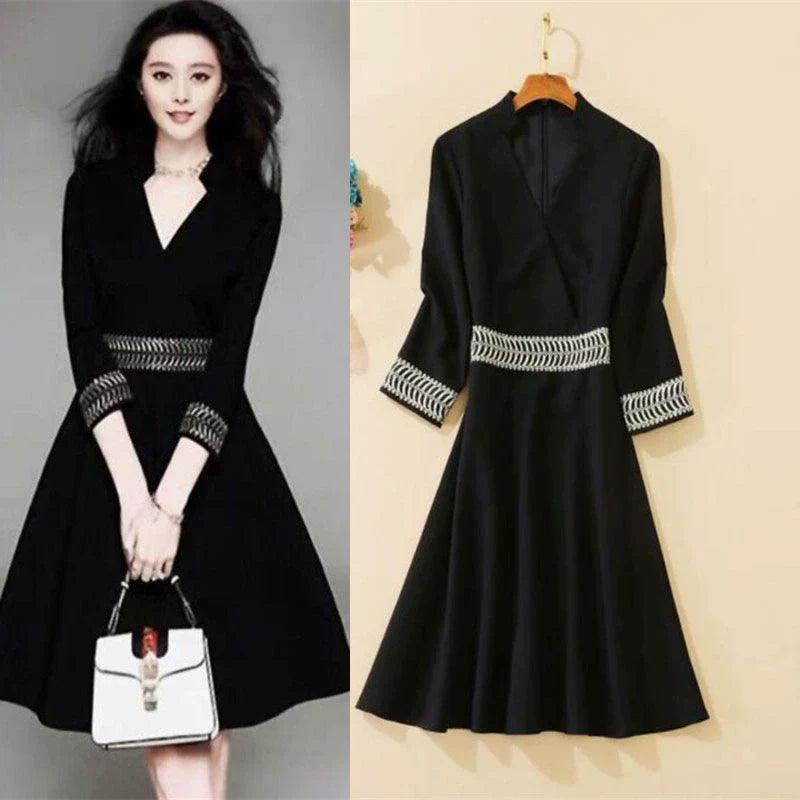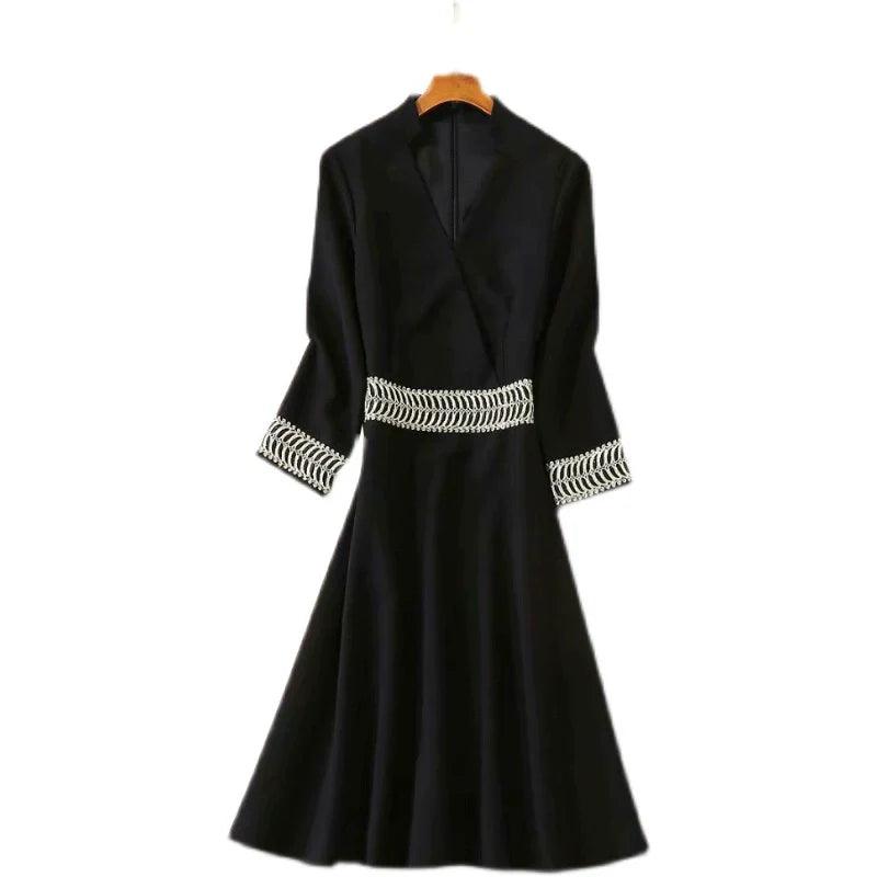 Autumn Elegance: Embroidered Black Dress with V Neckline
