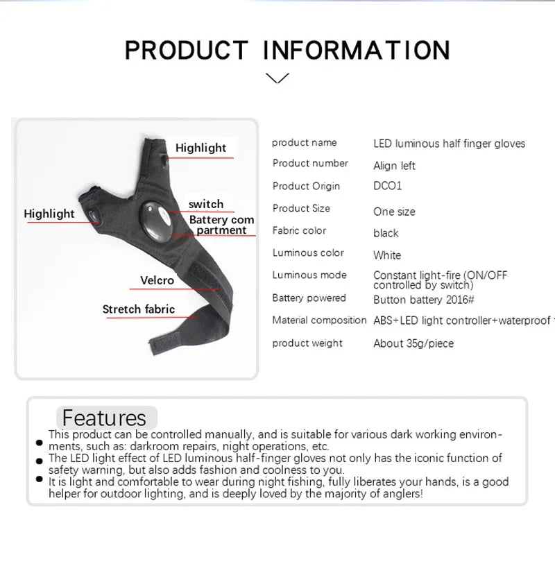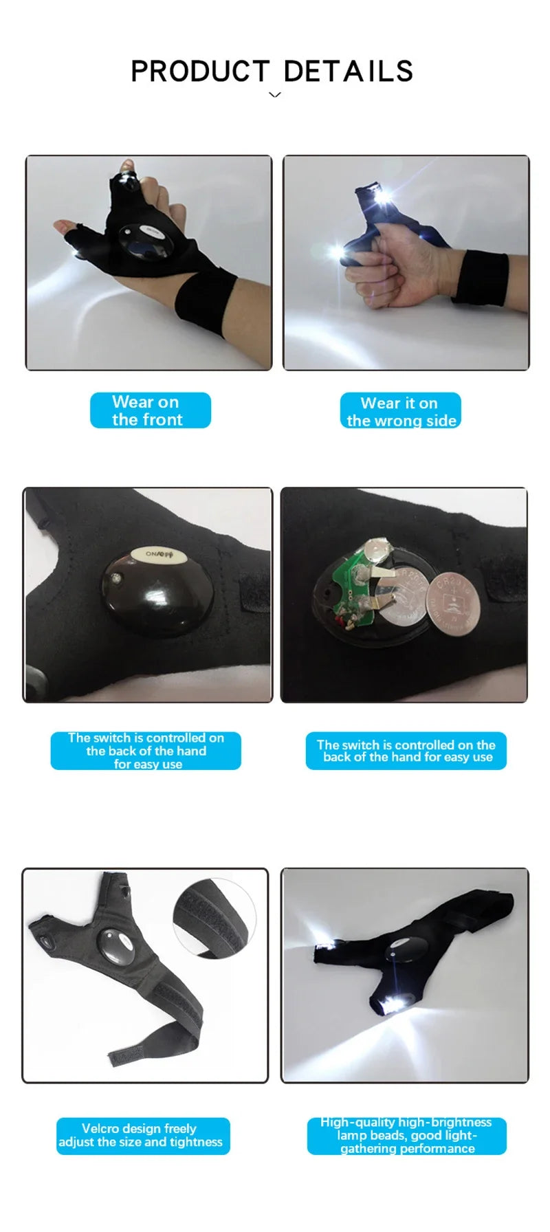 Don't let darkness hold you back! Grab your Fingerless Gloves LED Flashlight Outdoor Fishing Camping Tools today and venture into the night with confidence. Order now!