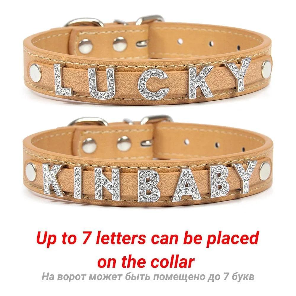 Leather Personalized Pet Collar with Rhinestone Letters for Dogs