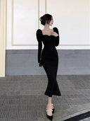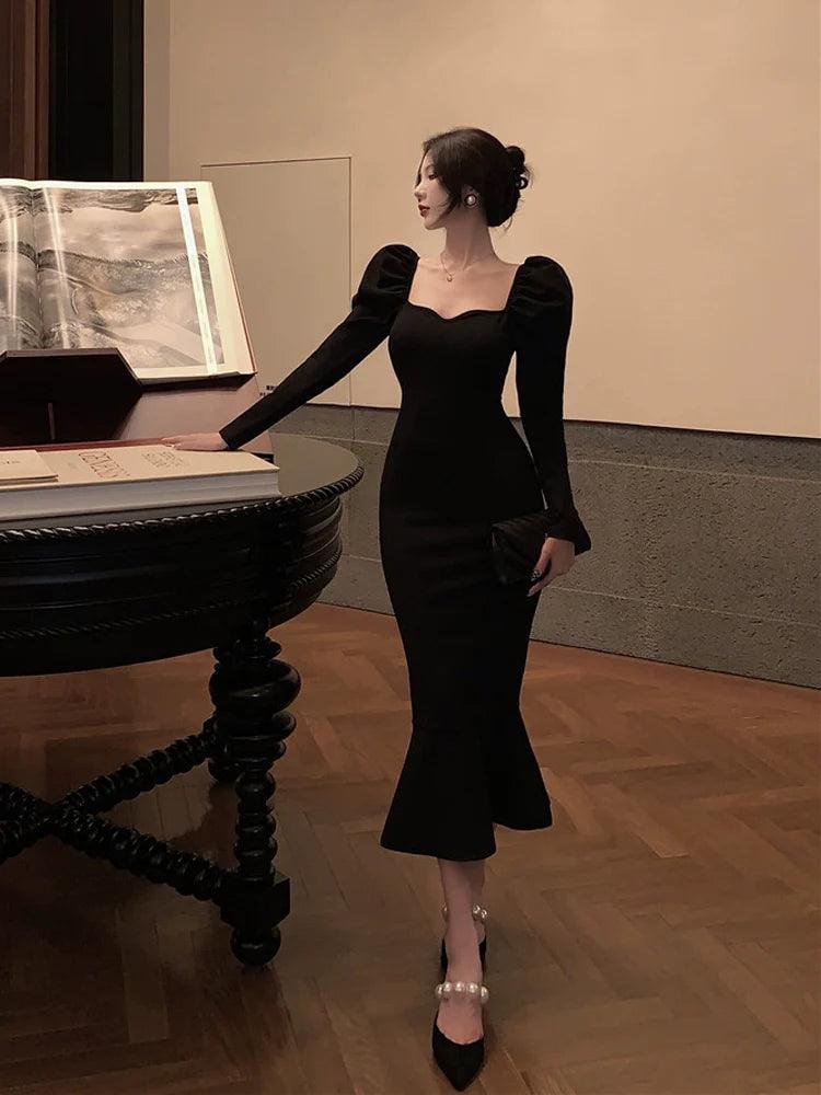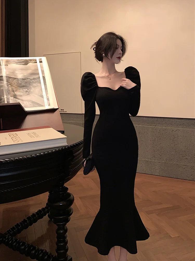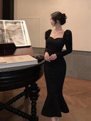 French Chic Black Fish Tail Dress Elegant Summer Fashion