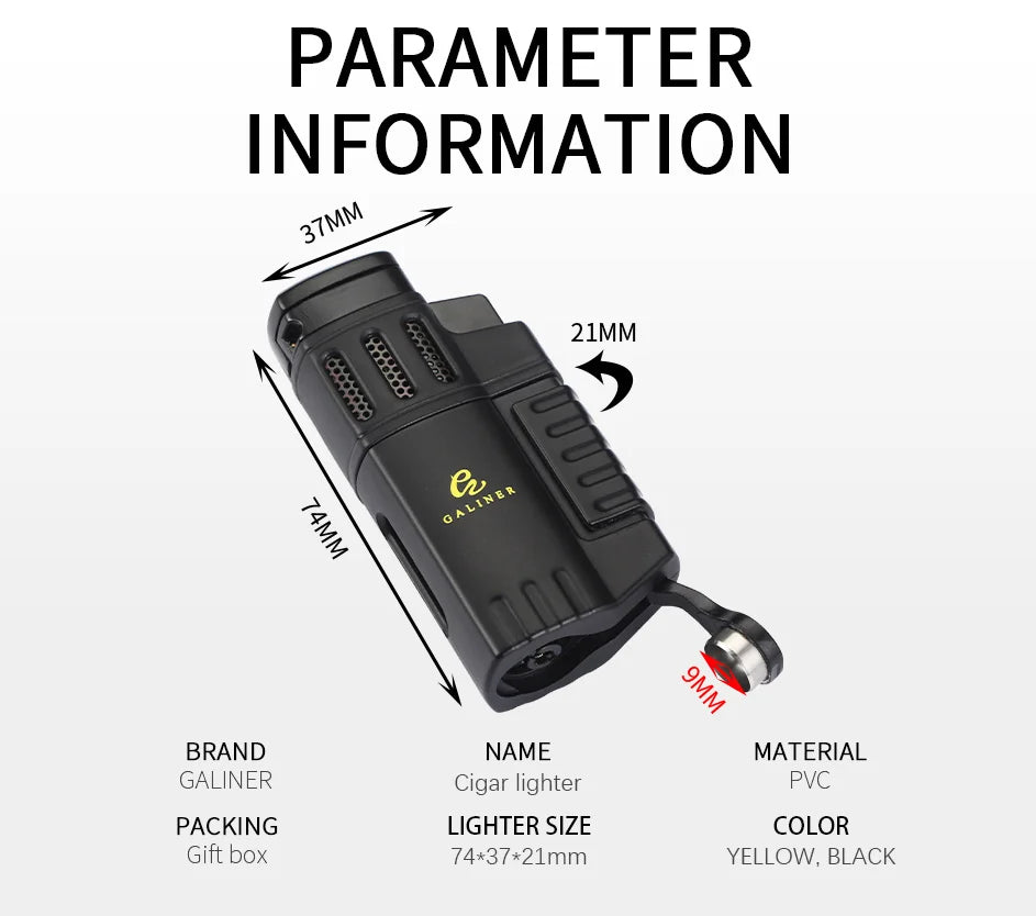 The Galiner Cigar Torch Lighter isn't just a tool; it's a statement. With its sleek design and exceptional performance, this lighter caters to the refined tastes of cigar lovers. Whether at a cozy gathering or a high-end lounge, this lighter will enhance your smoking ritual.