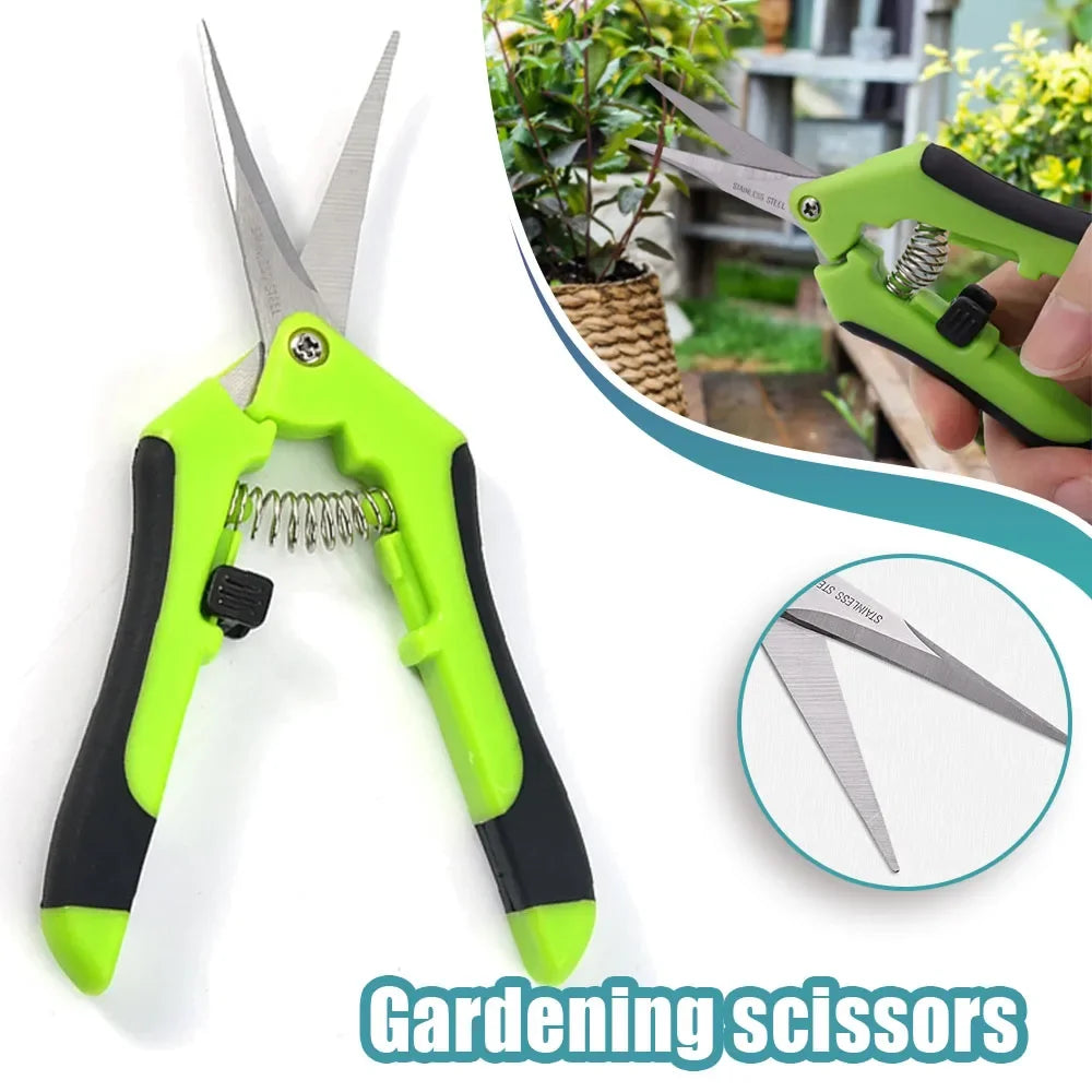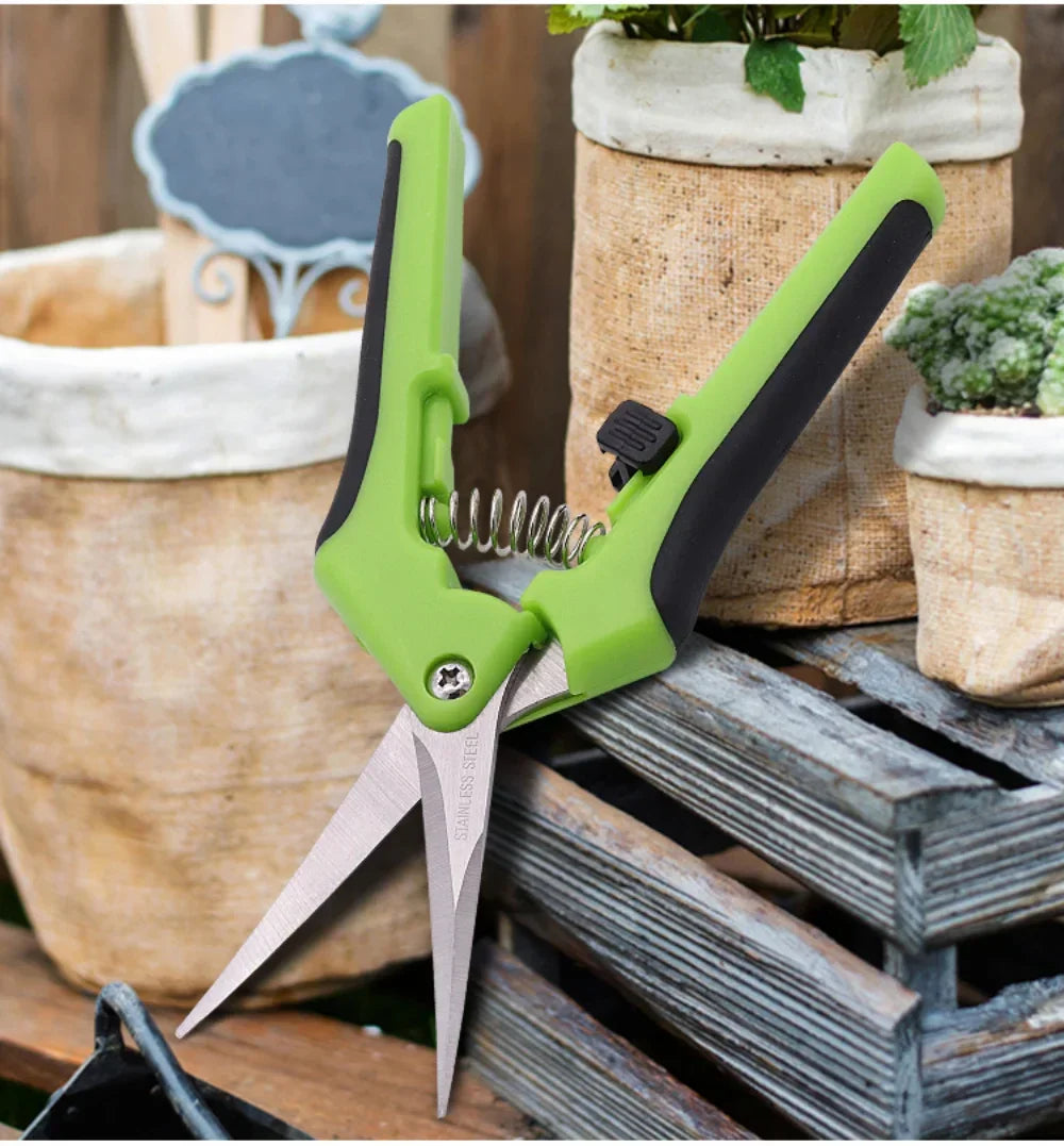 Gardening Pruning Shears Garden Tools Scissors Potted Plants deliver precision for bonsai, indoor care, and outdoor gardening. Made from rust-resistant stainless steel with an ergonomic lightweight plastic handle, they reduce hand fatigue and provide clean, accurate cuts on buds, leaves, and fruit. A secure safety lock ensures safe storage.