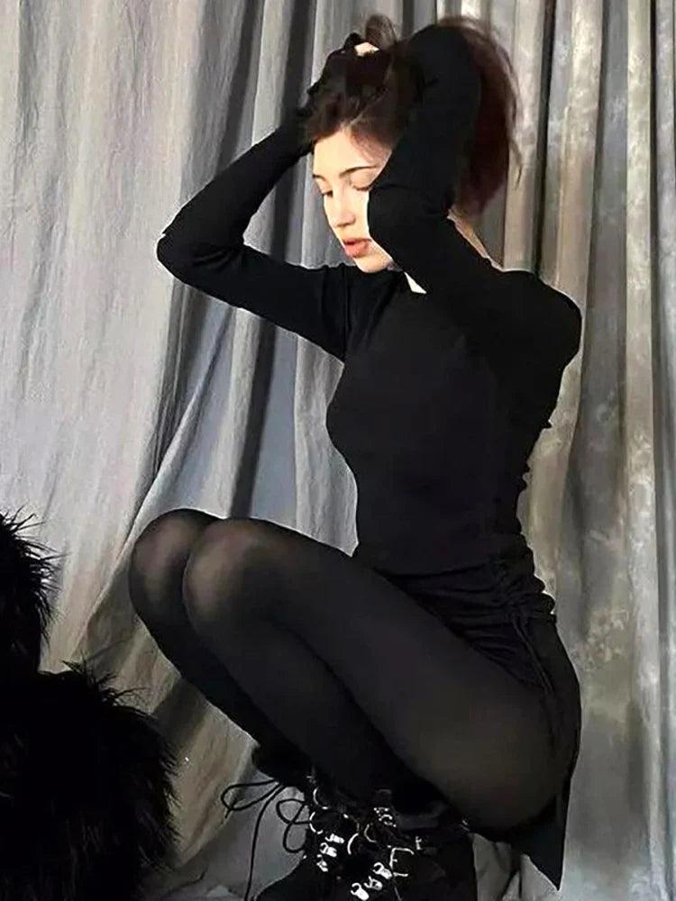 Introducing the Gothic Drawstring Bodycon Mini Dress for Edgy Women, a stunning piece that effortlessly blends punk and grunge aesthetics with contemporary style. Designed for the bold woman, this dress makes a striking statement, perfect for autumn parties or any occasion where you want to turn heads.