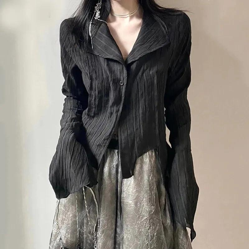 Elevate your fashion game with our Korean Gothic Black Shirt Dark Academia Style for Women. This stunning shirt expertly combines elegance and a hint of edge, making it a must-have for every modern wardrobe.