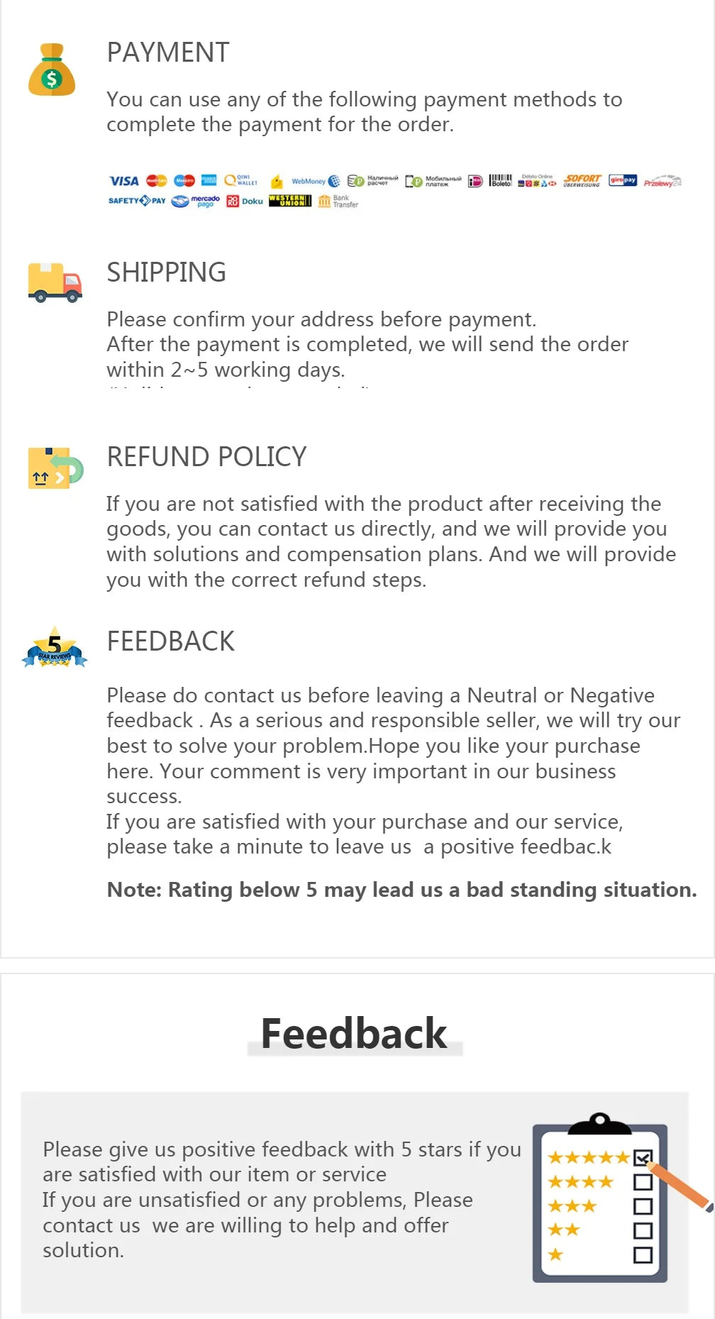 30 days returns. 100% Money back guaranteed no question ask. If the mistake is from Us. See details