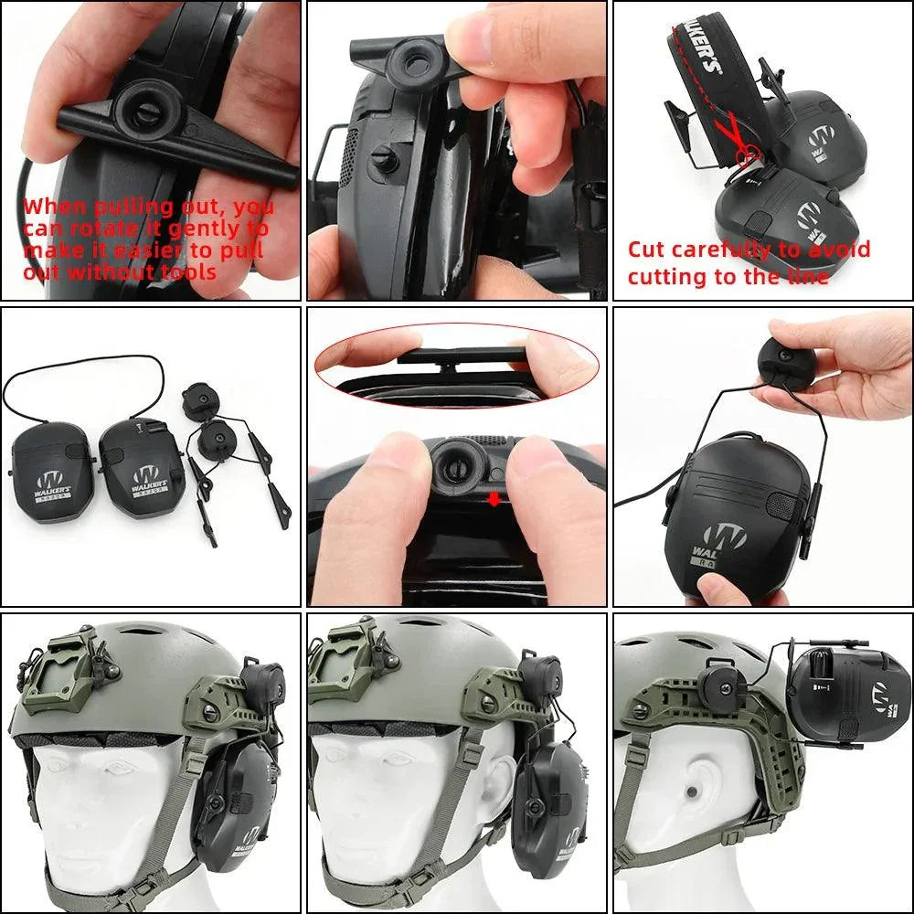 Hearing Protection Tactical Headset ARC Rail Adapters Set delivers secure compatibility with Walker Razor Patriot earmuffs and ARC rails, plus FAST/ACH helmets, enabling comfortable shooting and hunting. Featuring an adjustable telescopic frame, rotatable adapters, quick tool-free installation, and durable ABS construction for lasting auditory safety, providing reliable protection in dusty conditions and rain.