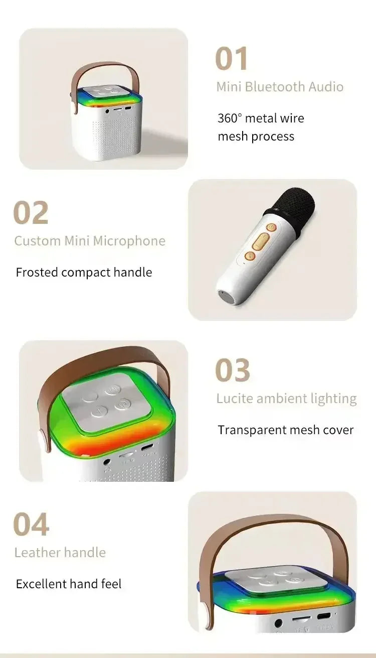 • Colorful LED Lights: Enhance your karaoke sessions with dynamic RGB LED lights that create a vibrant atmosphere.