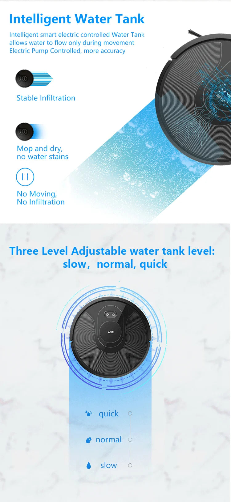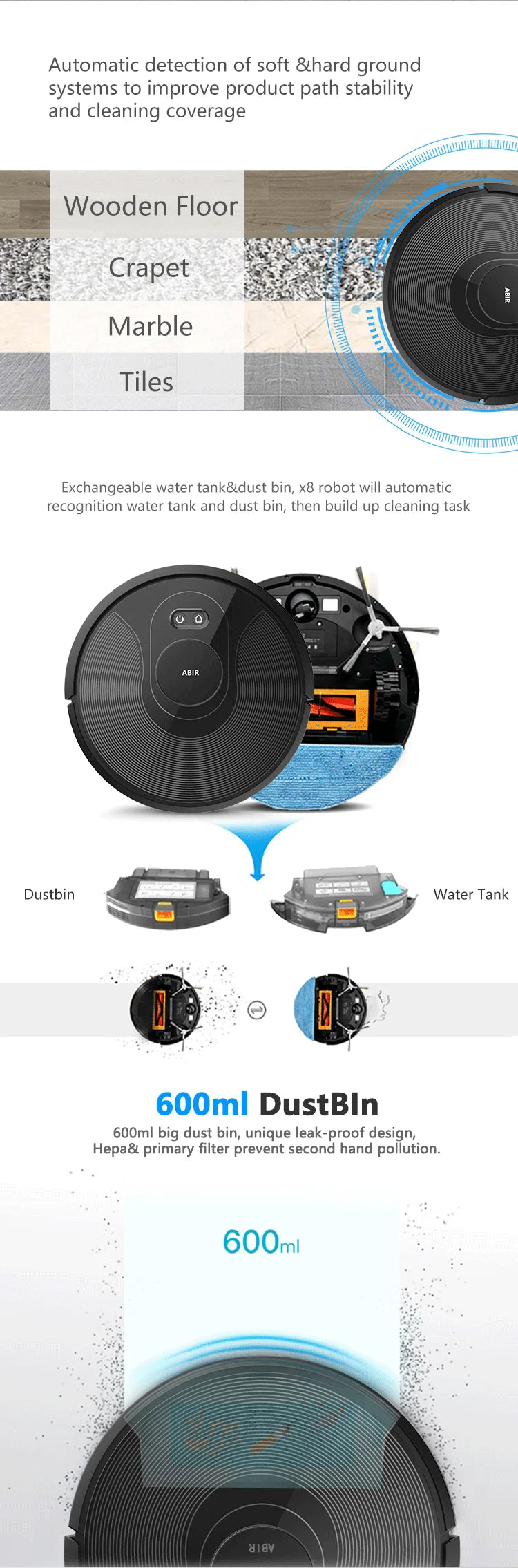 • Powerful Suction: With a suction power exceeding 2499Pa, the ABIR X8 efficiently removes dirt and debris from carpets, tiles, and hardwood floors.