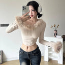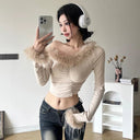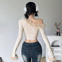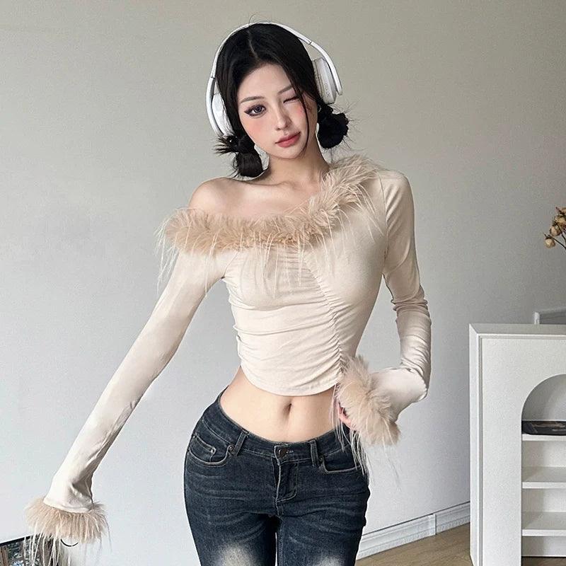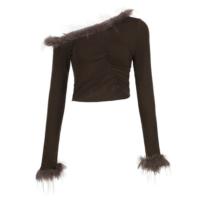 Retro Furry Patchwork One-Shoulder T-Shirt Autumn Style