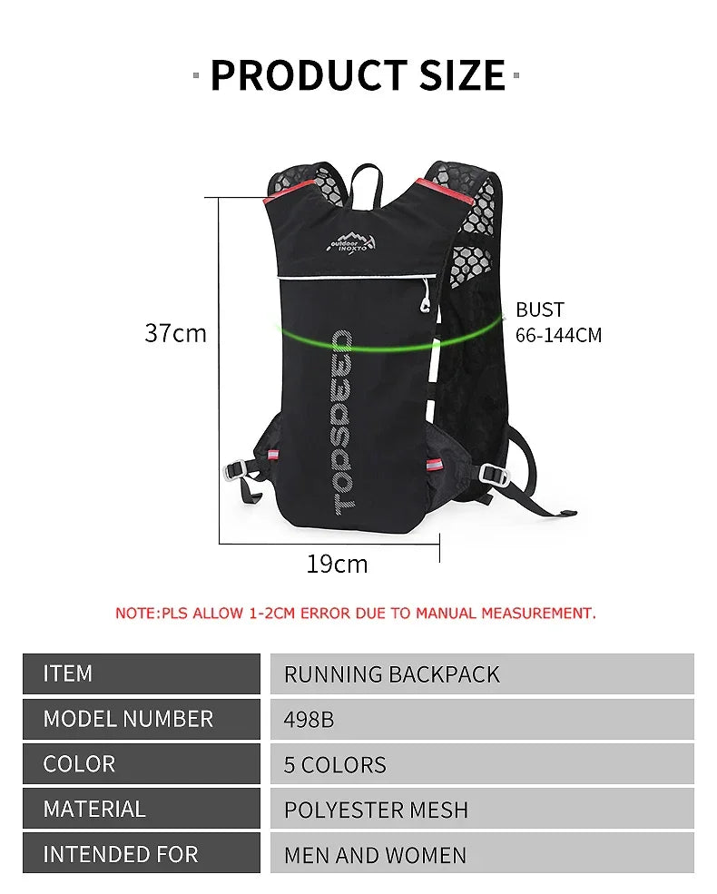Ultra Lightweight INOXTO 5L Trail Running Hydration Vest delivers featherweight comfort with 5L storage for marathoners, cyclists, and trail runners. Stay hydrated with 1.5L or 2L water bags, enjoy a unisex ergonomic fit, and trust durable PP fabric for long-lasting performance on rugged routes and long training sessions.