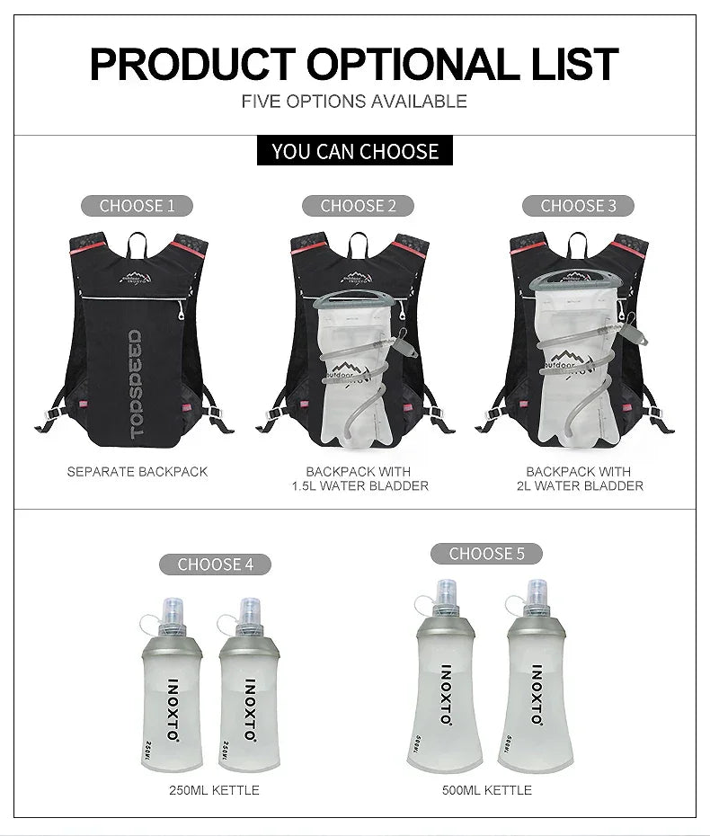 Whether you're tackling a rigorous marathon or enjoying a casual cycle ride, the Ultra-Lightweight INOXTO 5L Trail Running Hydration Vest enhances your experience by providing easy access to hydration and storage. Its ergonomic design and adjustable fit ensure that you stay comfortable and focused on your performance.