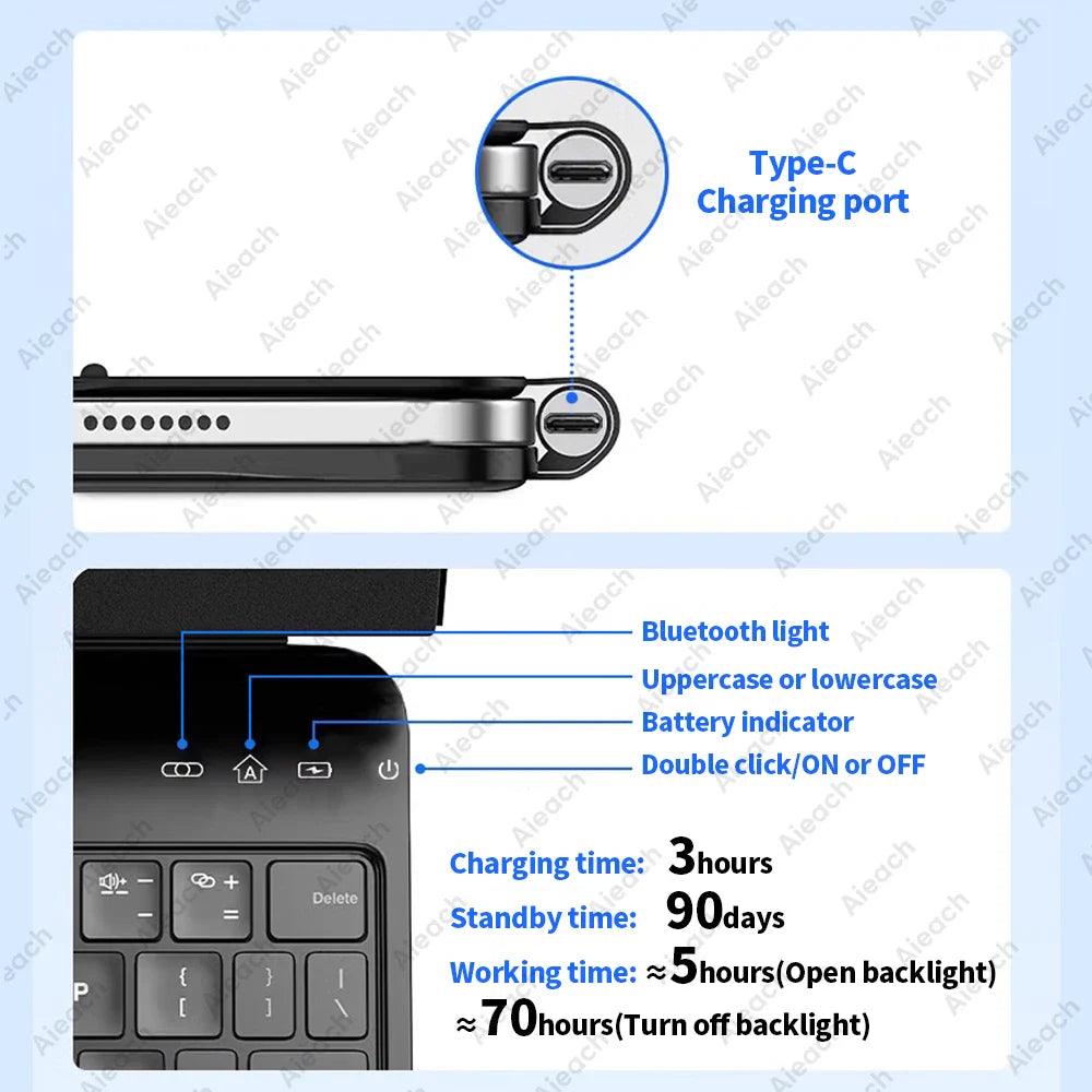 This Magic Keyboard Case for iPad Air with Backlit Keyboard not only offers robust protection for your device but also features a long battery life and smart power-saving technology. It automatically wakes and sleeps your iPad, ensuring that you can work from anywhere with its lightweight and slim design.