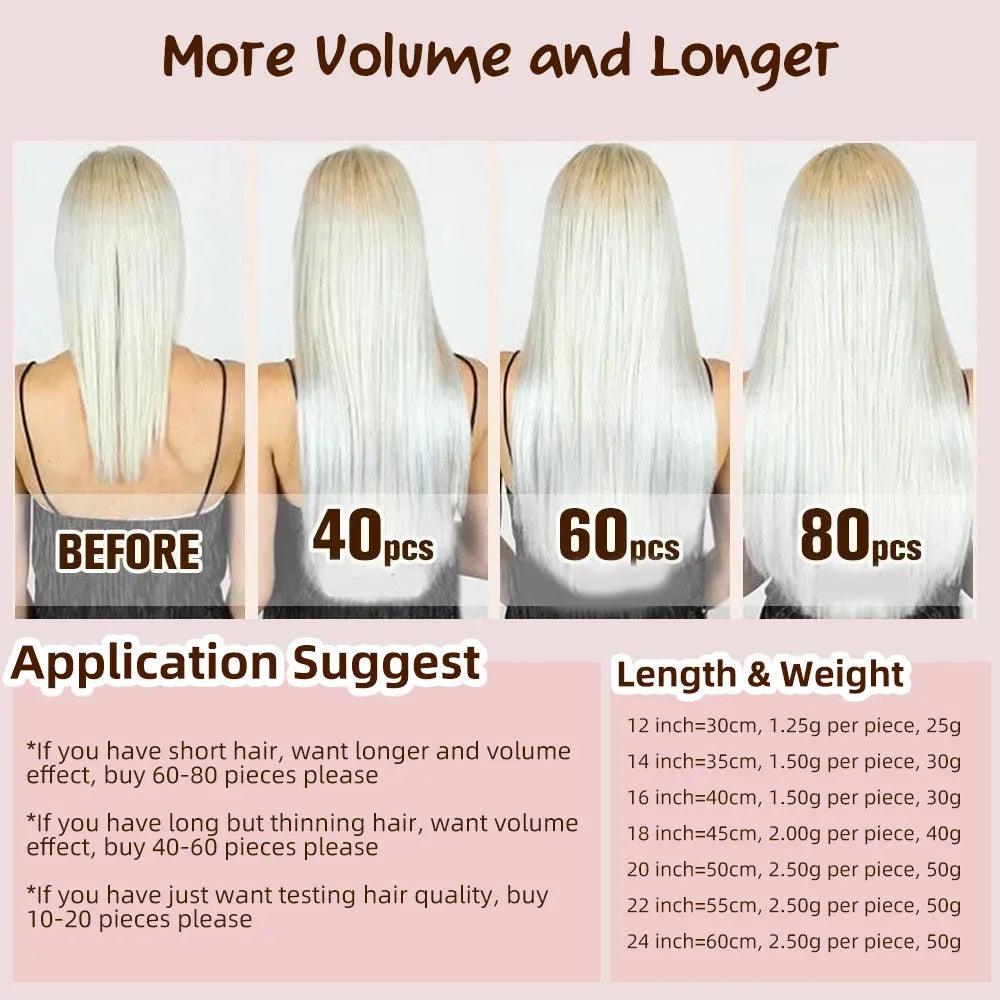 • 40-60 pieces for long, thinner hair desiring extra volume.