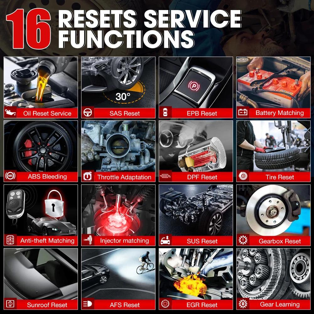 • 16 Service Resets: Easily reset functions such as Oil Reset, ABS Bleeding, and Electronic Parking Brake Reset.