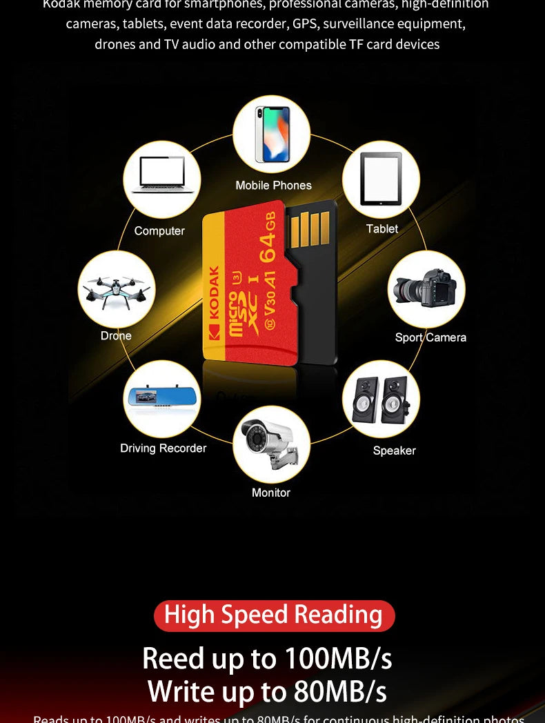 Discover the unparalleled performance of the KODAK Micro SD Card Class10 U3 Memory Card 64GB 128GB 256GB, expertly crafted for your smartphones, tablets, and cameras. With this memory card, high-speed storage and retrieval are at your fingertips, ensuring your data is always accessible.