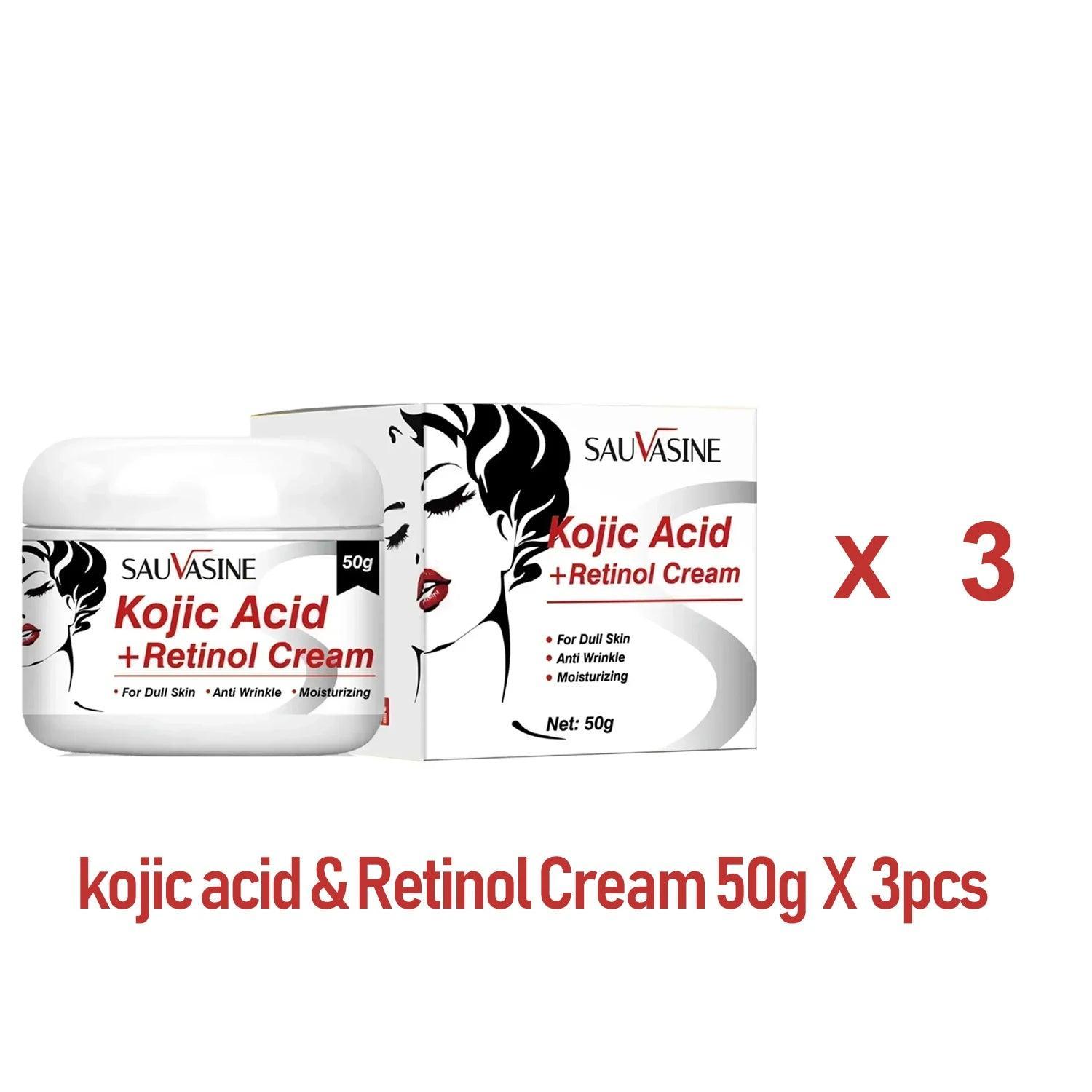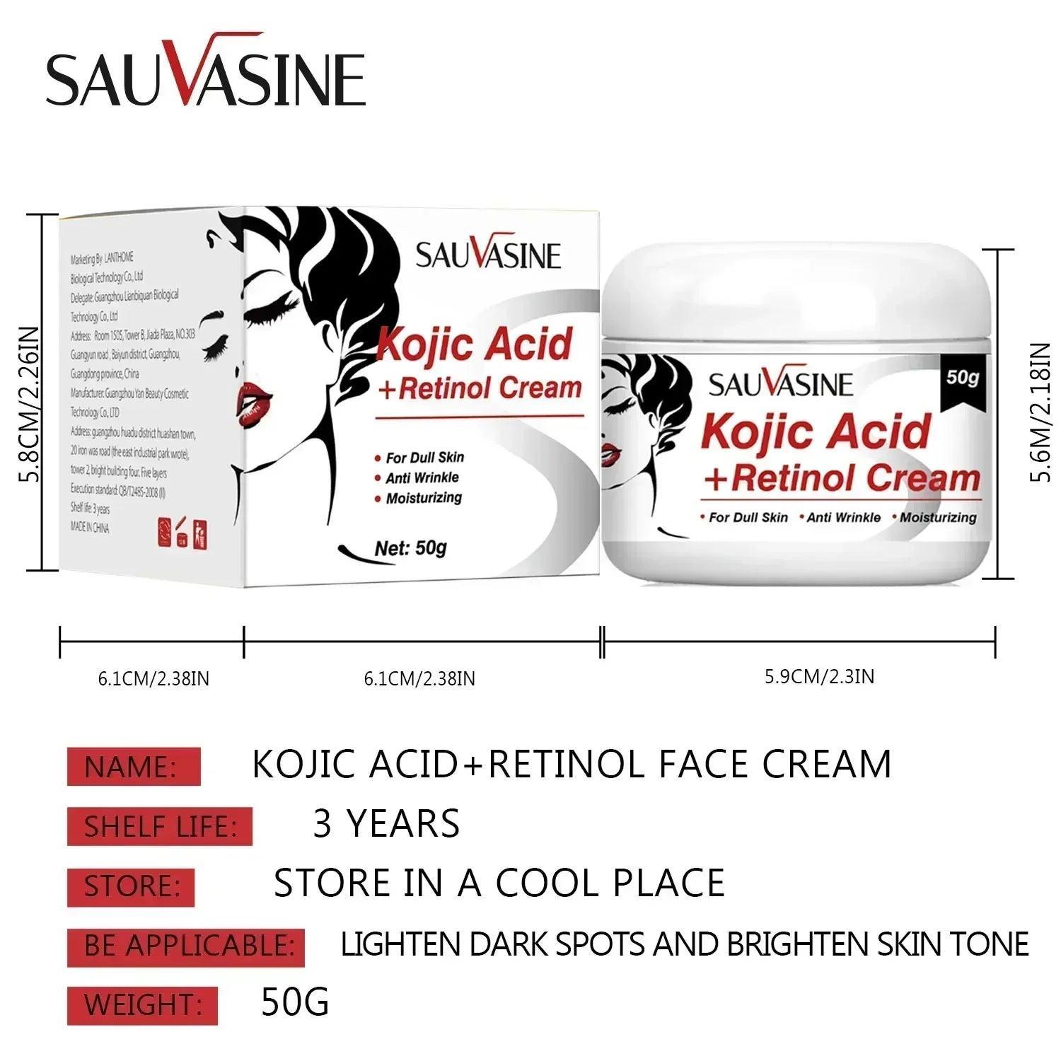 • Brightening Formula: Infused with a potent blend of natural ingredients such as Kojic Acid and Retinol, this cream effectively fades sunspots and protects against new free radicals caused by sun exposure.