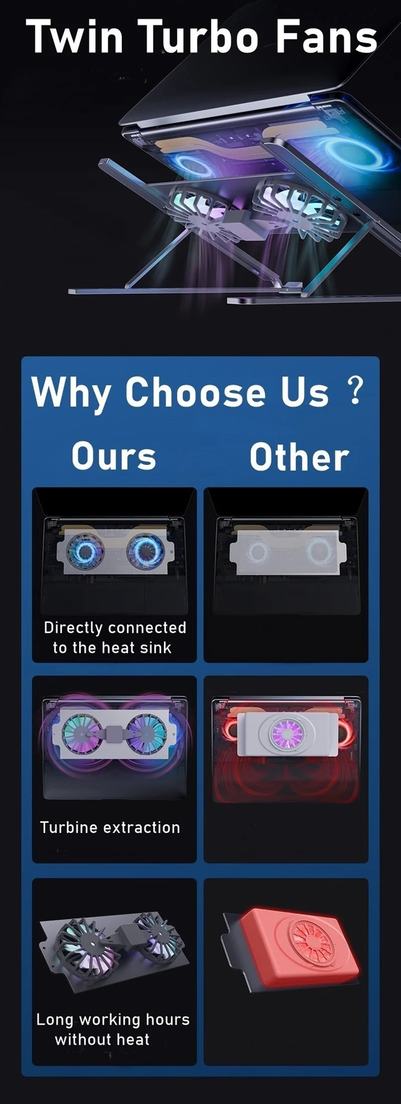 • Twin-Turbo Fan Design: Dual USB fans align seamlessly with your laptop's cooling vents for efficient heat dissipation.