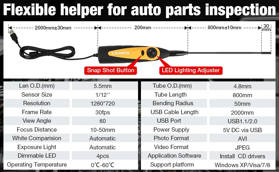 The LAUNCH VSP600 Videoscope Camera Endoscope Car Inspection Mirror is the ultimate inspection tool that every automotive technician and DIY enthusiast needs. Engineered for excellence, this versatile device combines flexibility and cutting-edge technology to provide unparalleled inspection capabilities.