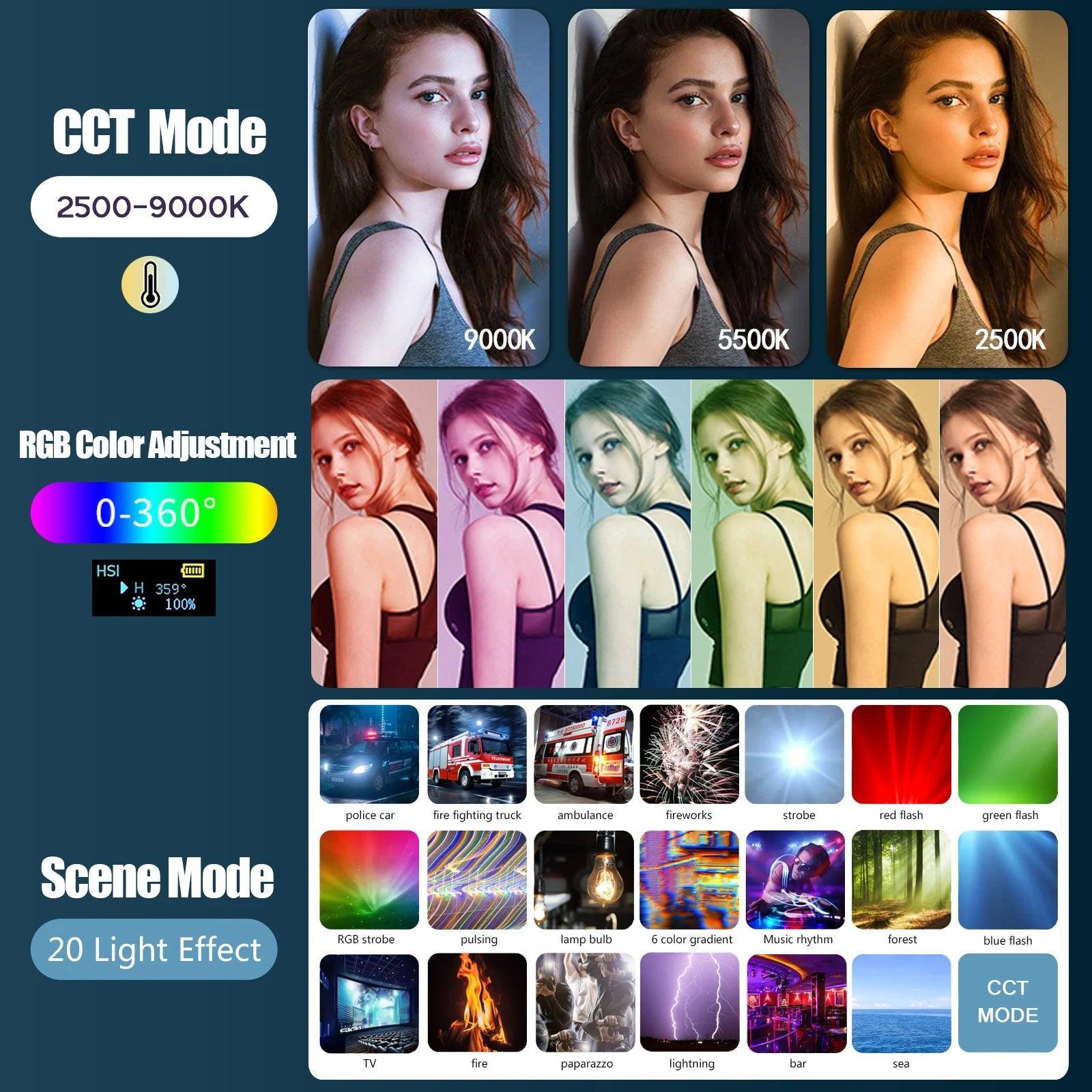 • Adjustable Color Temperature: Customize your lighting from a warm 2500K to a cool 9000K, adapting effortlessly to any shooting environment.
