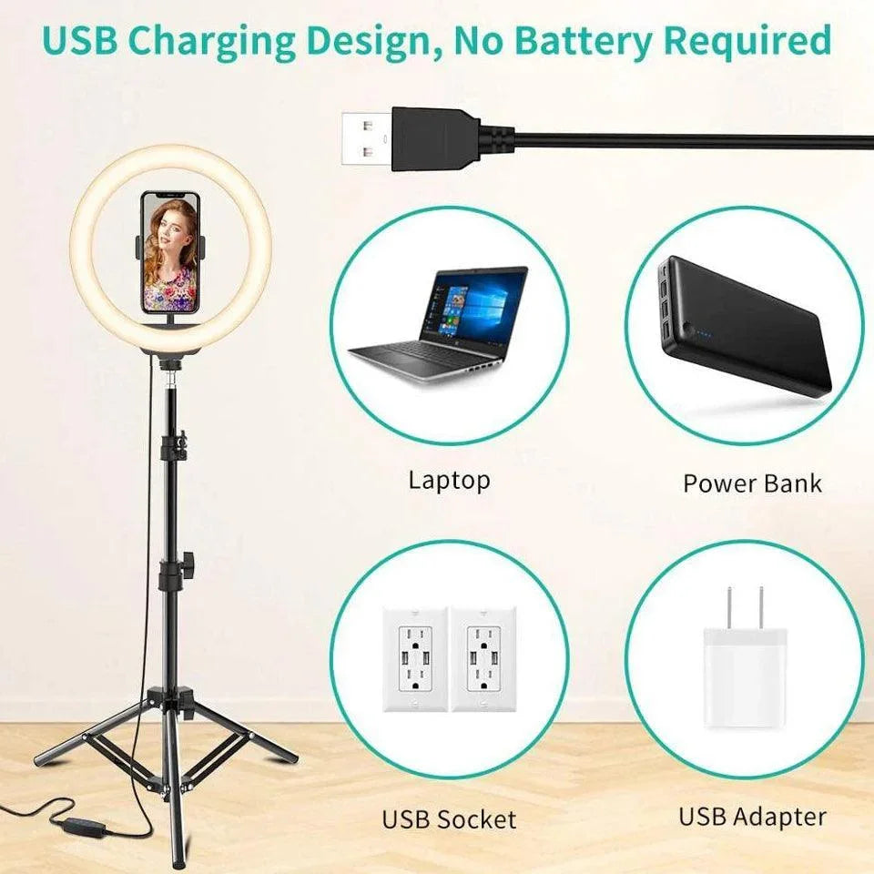 Professional LED Ring Light Kit With Bluetooth Remote delivers studio-grade brightness with 120 bulbs, 3 color modes, 10 brightness levels, and 360° rotation. USB-powered with a Bluetooth remote, this solution powers up quickly for makeup, photography, and video creation, anywhere you work, with adjustable tripod heights 50cm–200cm for perfect framing.