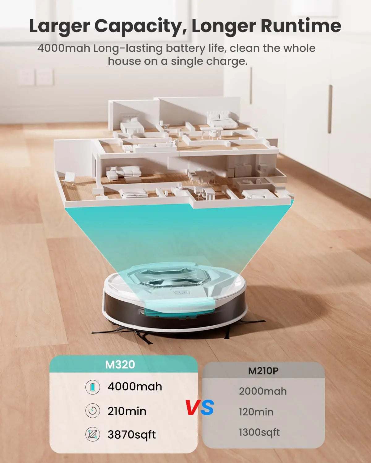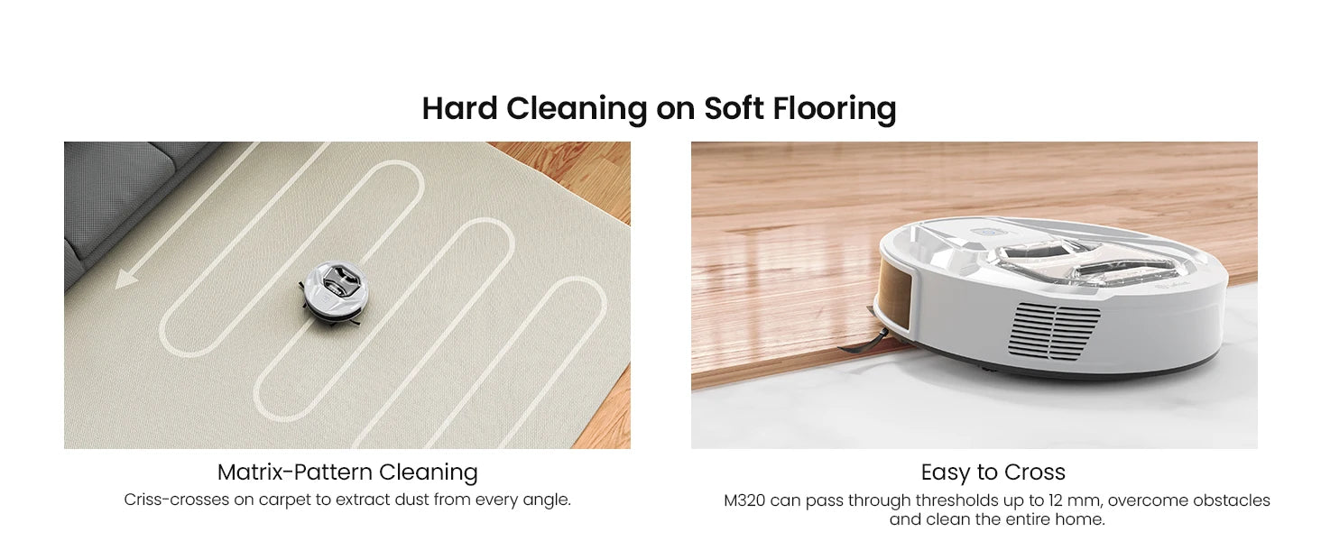 Pet owners will rejoice as the M320 is certified for zero tangles, eliminating the hassle of hair getting stuck in the brushes. This 3. Powerful Suction Robot Vacuum Cleaner is equipped with: